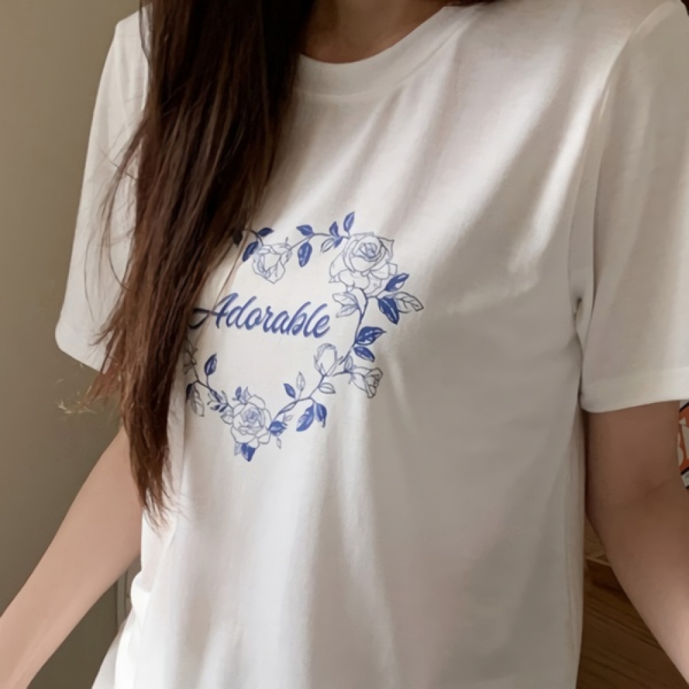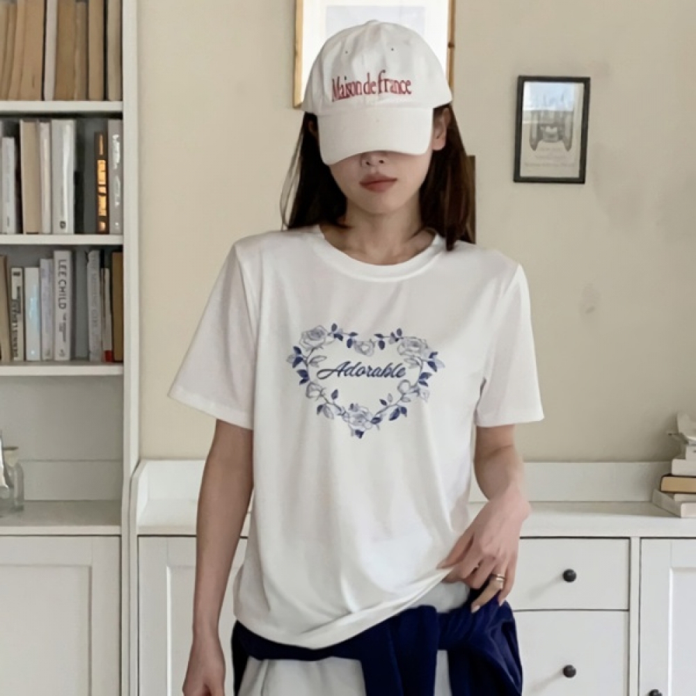 여성 하트 플라워 프린팅 베이직 반팔 티셔츠