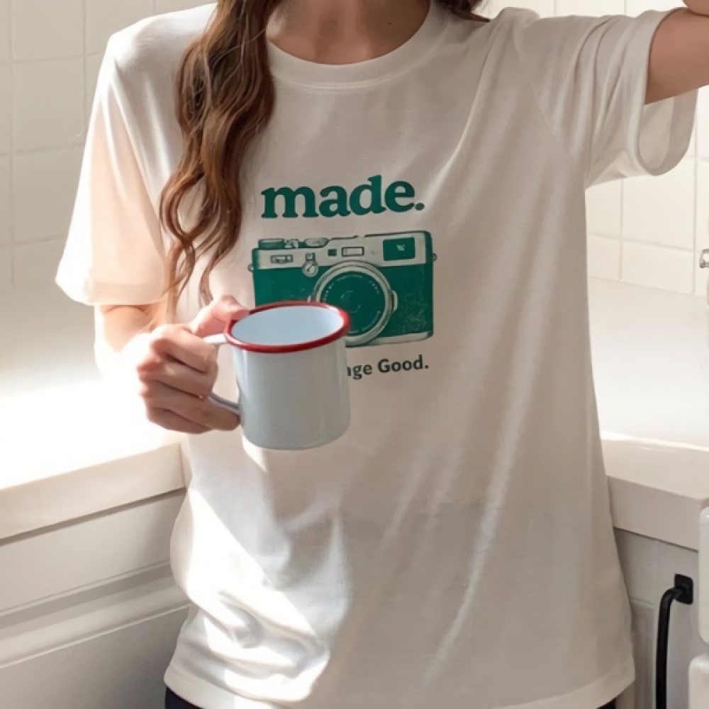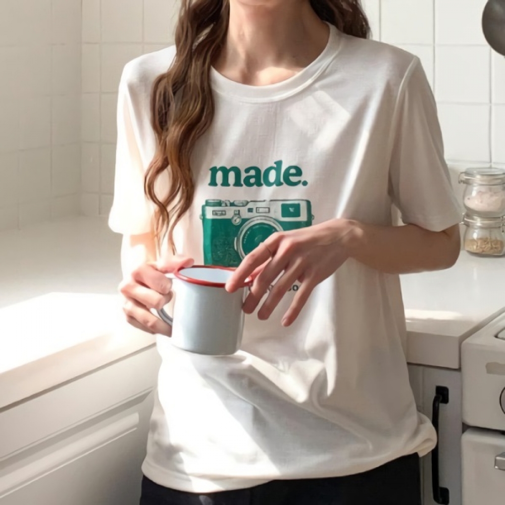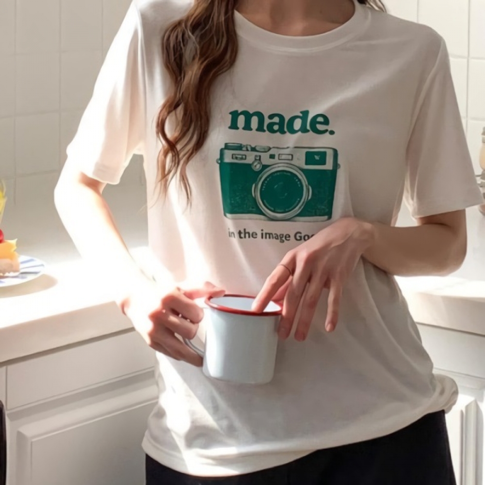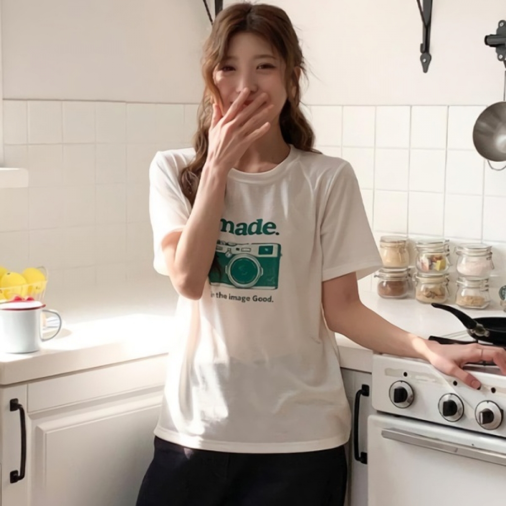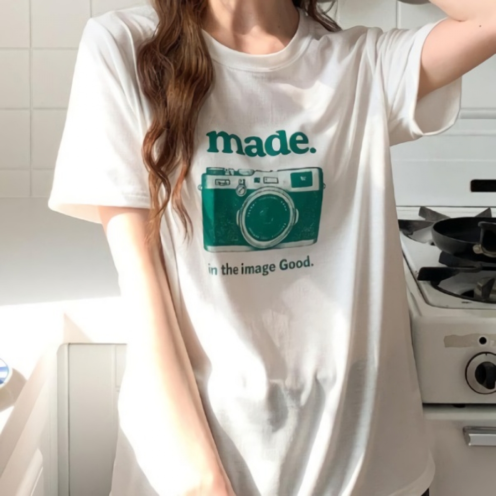여성 카메라 프린팅 루즈핏 스판 반팔티
