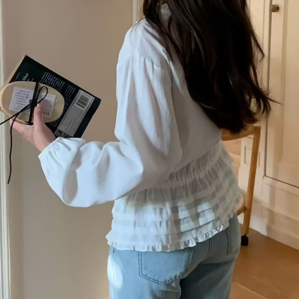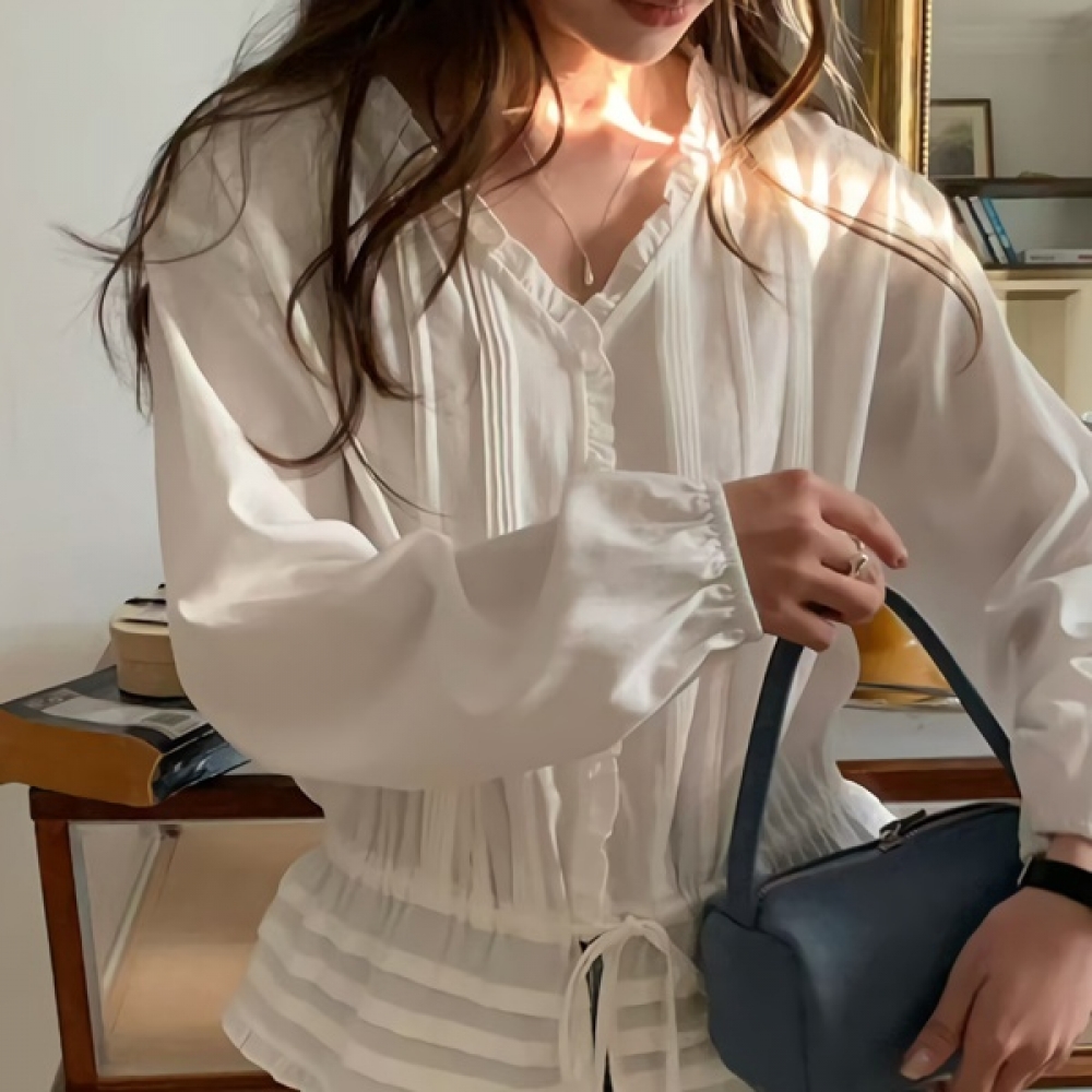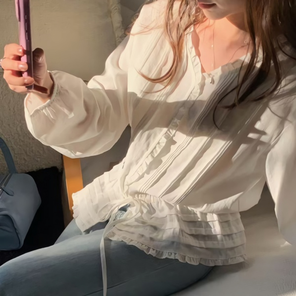 여성 코튼 러플 브이넥 리본 퍼프 블라우스