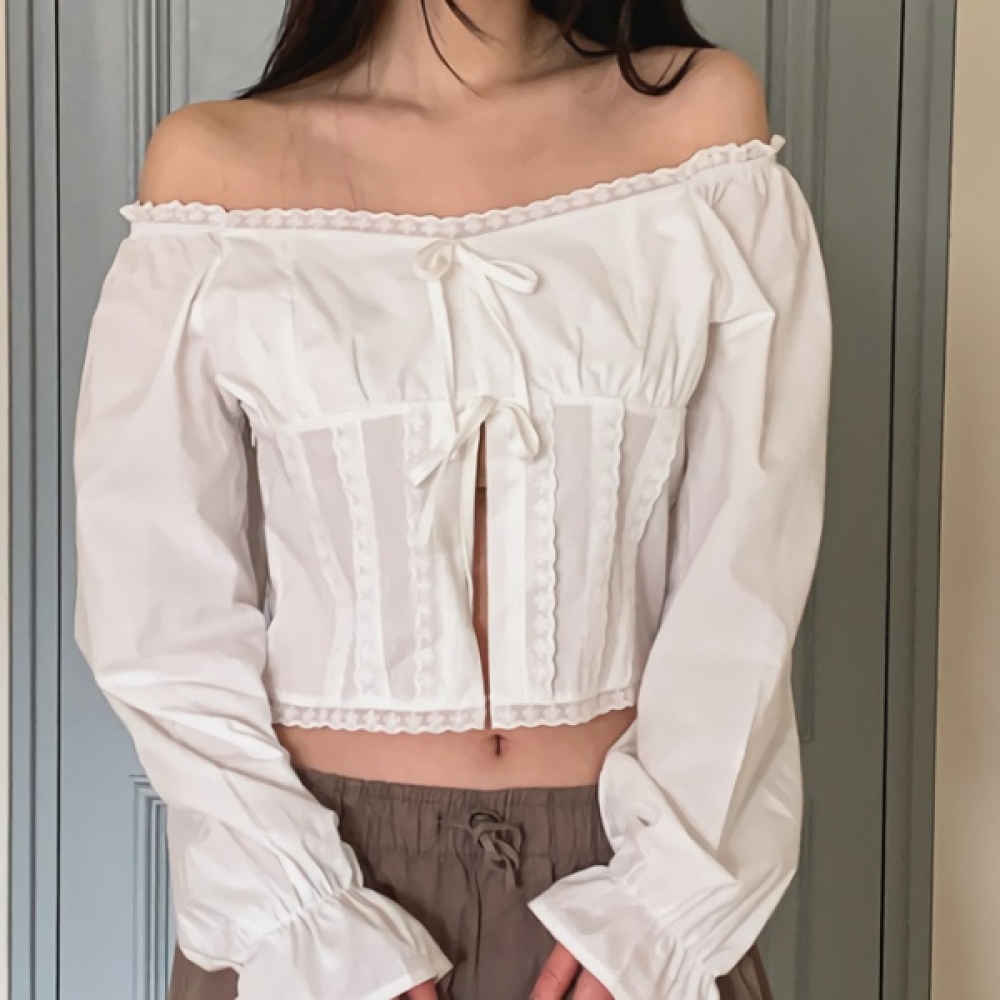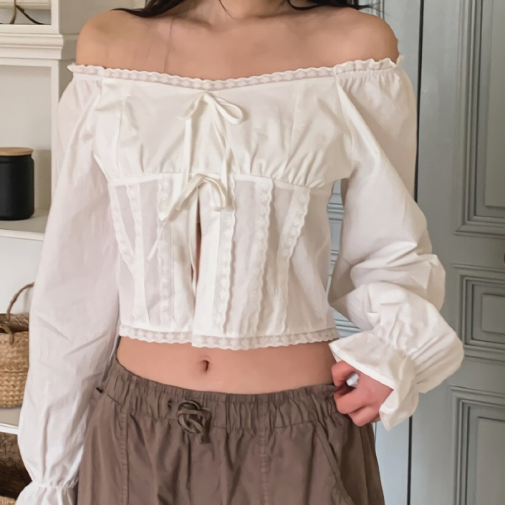 여성 리본 레이스 오프숄더 크롭 블라우스
