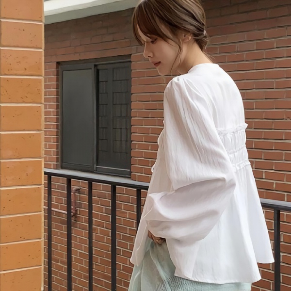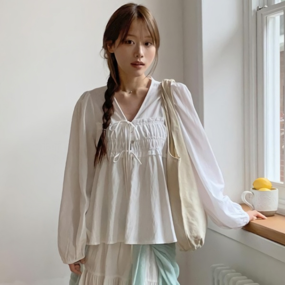여성 코튼 러플 브이넥 리본 퍼프 블라우스