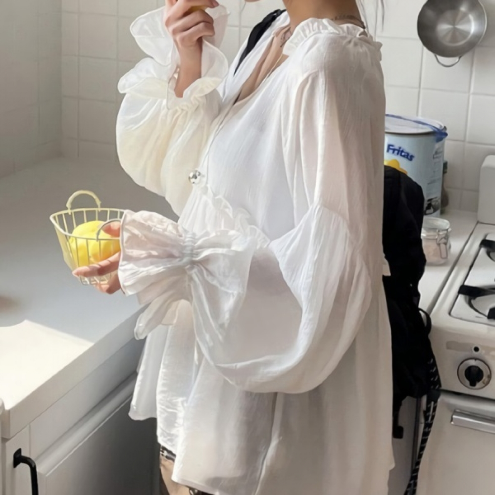 여성 코튼 러플 브이넥 리본 퍼프 블라우스