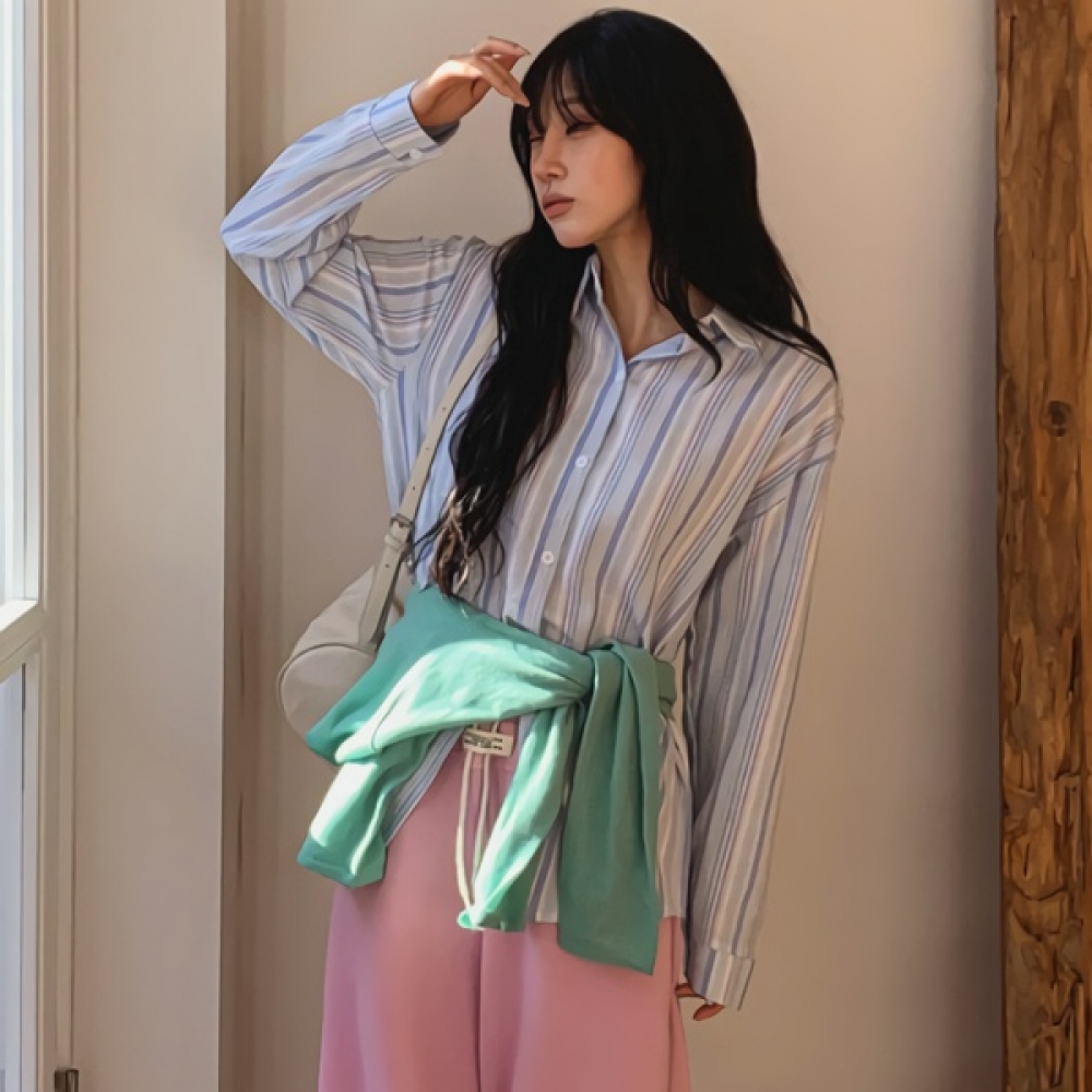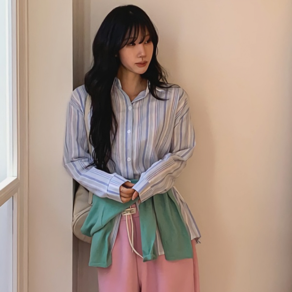 여성 오버핏 컬러 스트라이프 카라 셔츠