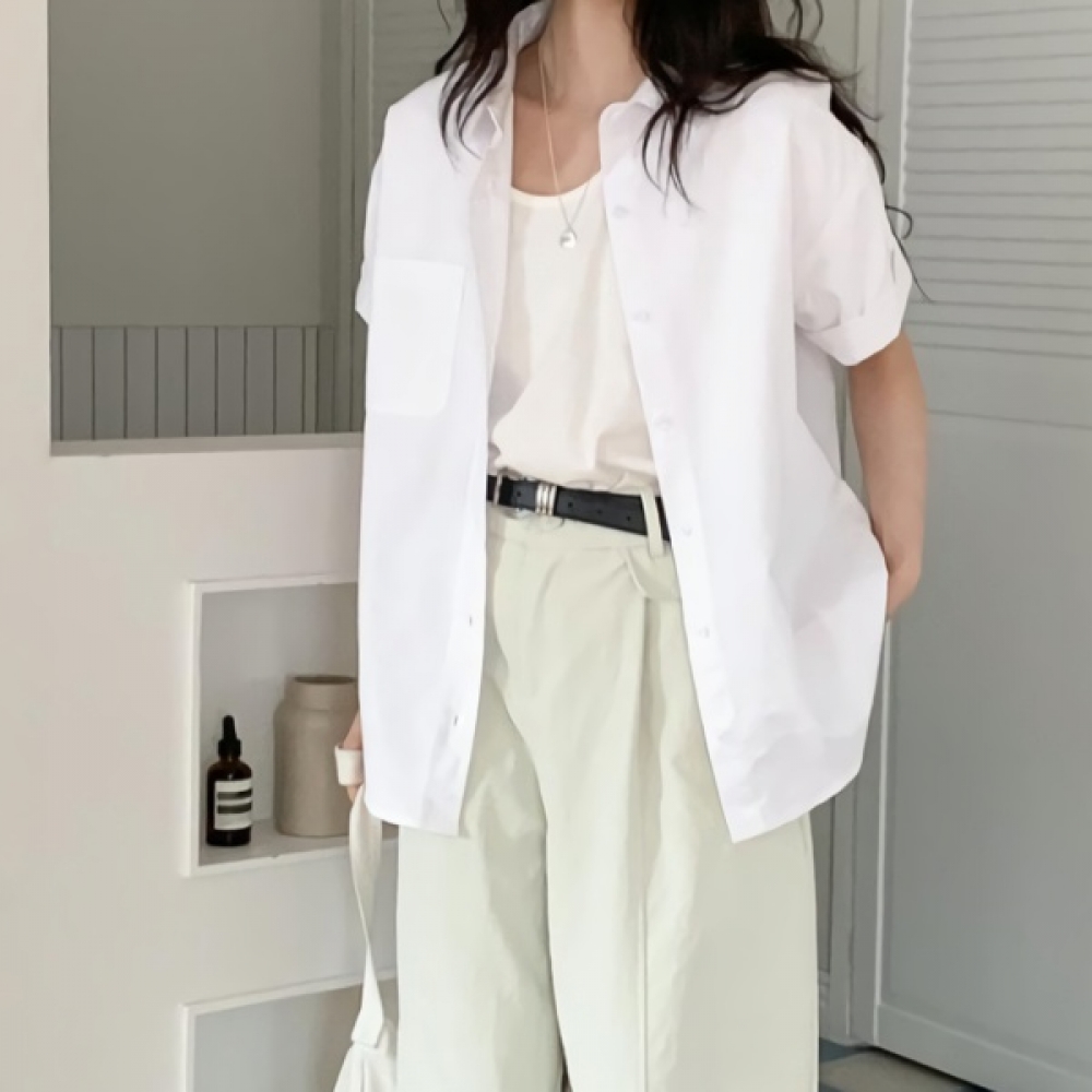 여성 봄 여름 오버핏 무지 포켓 코튼 셔츠