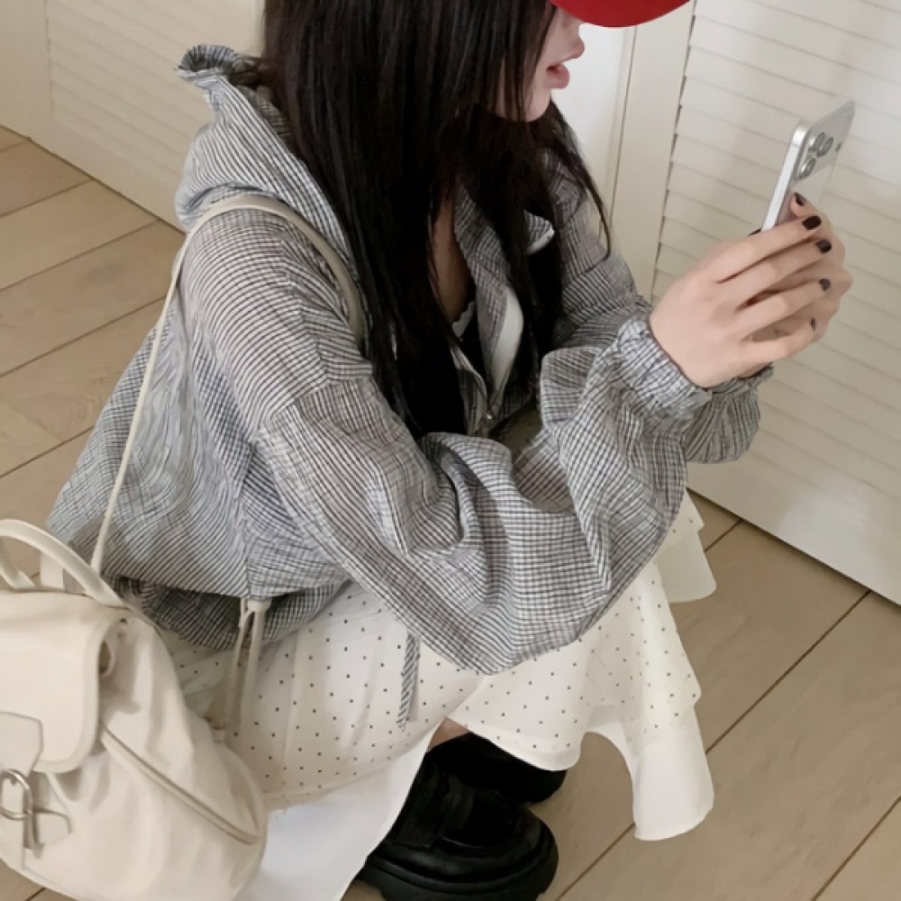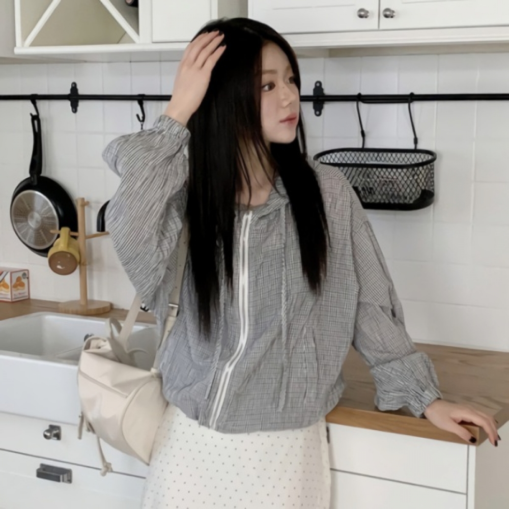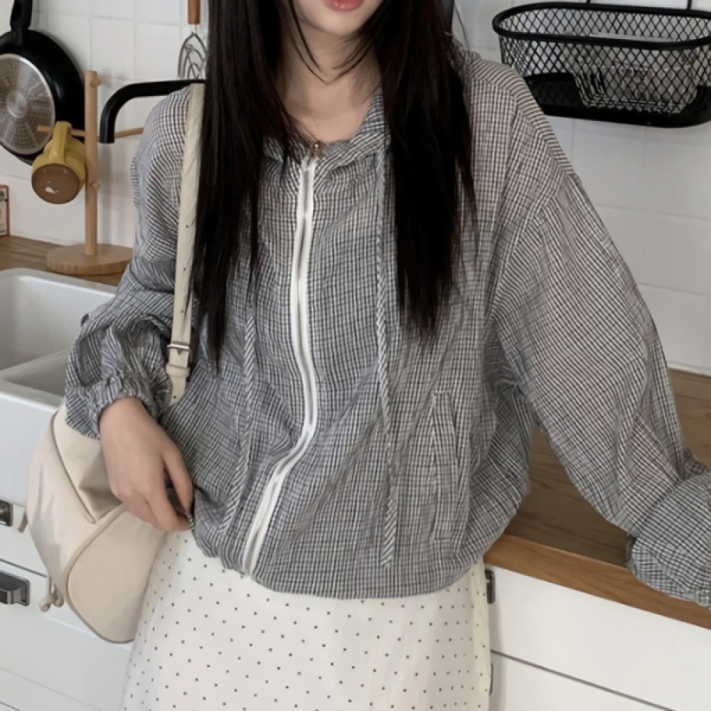 여성 봄 여름 체크 후드 집업 윈드 자켓