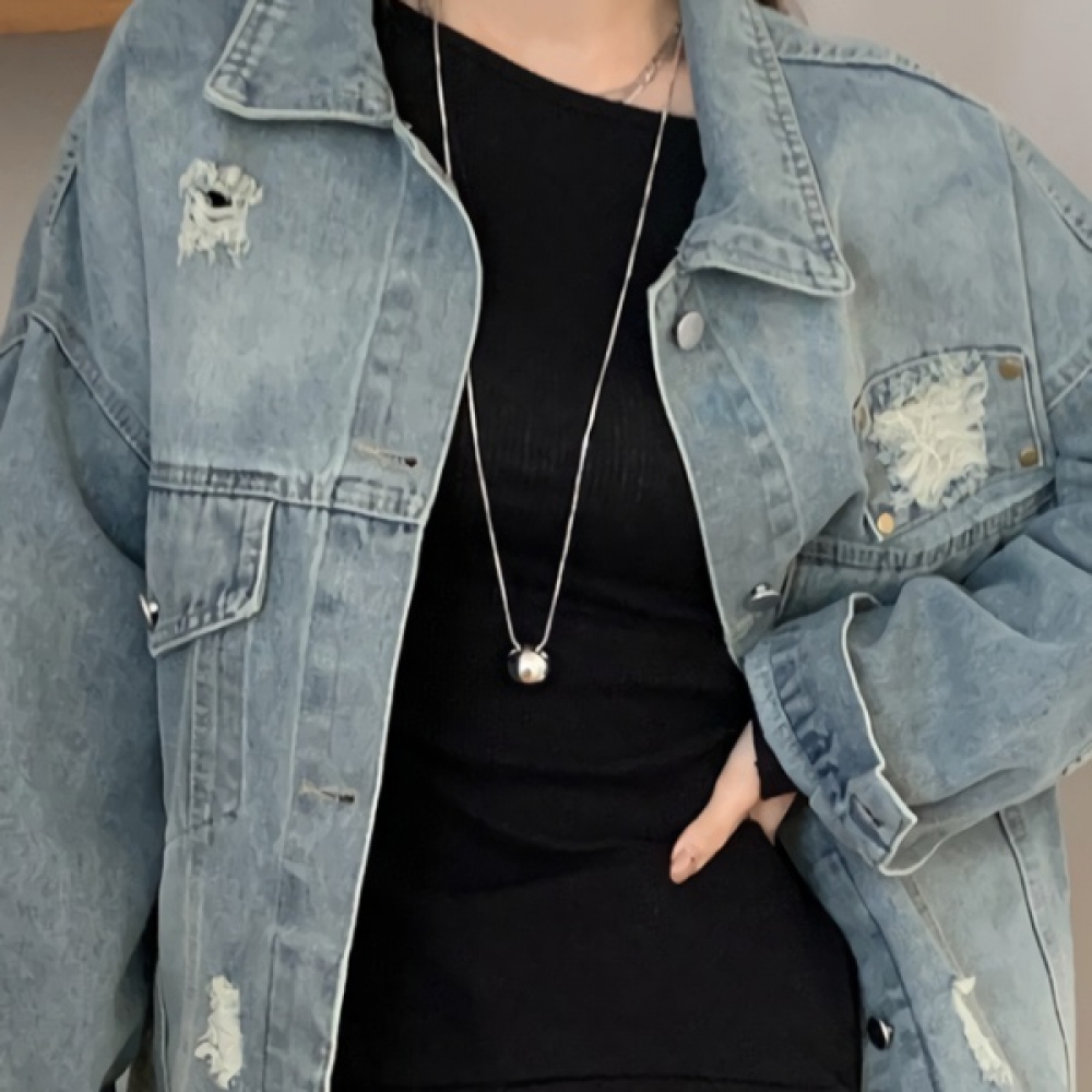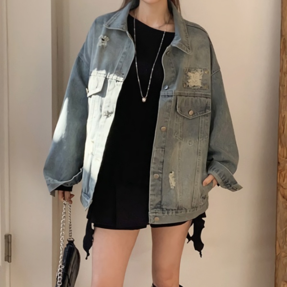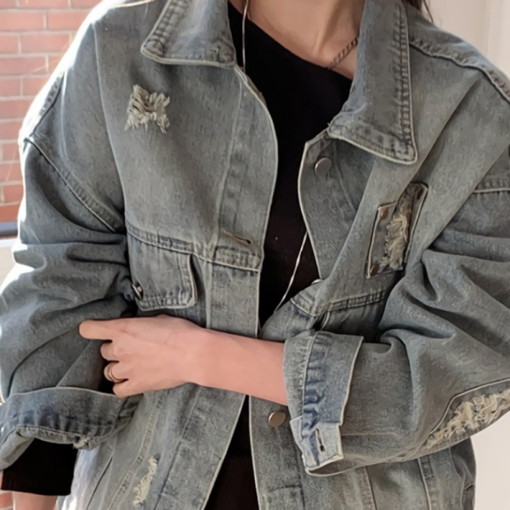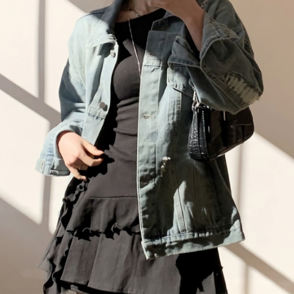 여성 봄 여름 빈티지 워싱 카라 청자켓