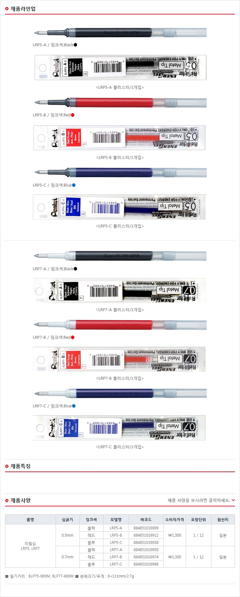 품명 및 모델명 에너겔 퍼머넌트 리필(LRP7) 0.7mm