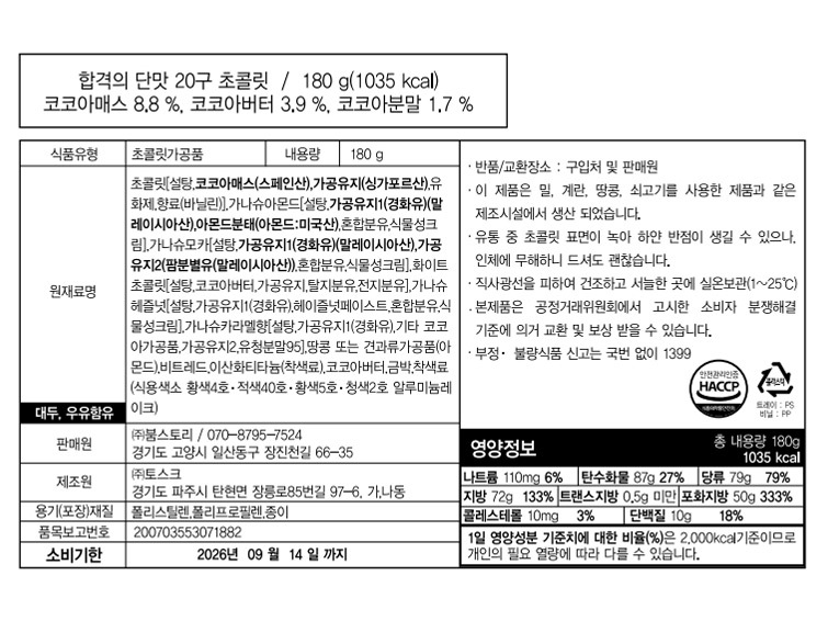 제과용다크초콜릿[백설탕,코코아메스,코코아버터,레스틴(대두),합성착향료(바닐린)] / 제과용화이트초콜릿[백설탕,코코아버터,탈지분유(우유),전지분유(우유),유화제(레시틴,글리세린지방산에스테르),합성착향료(바닐린)] / 가나슈모카[식물성유지,백설탕,혼합분유(우유),전지분골드,유당(우유),모카커피,코코아분말,헤즐넛페이스트,유화제(레시틴,글리세린지방산에스테르),합성착향료(커피향바닐린)] / 가나슈블루베리[식물성유지,백설탕,탈지분유(우유),전지분유, |
