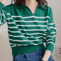 여성 스트라이프 배색 카라 레이어드 니트