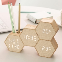 베이지브라운 허니콤 우드 인테리어 LED 탁상시계