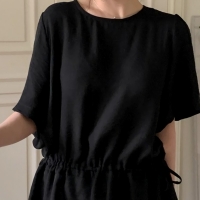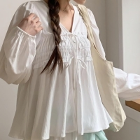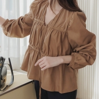 여성 브이넥 셔링 리본 포인트 루즈핏 블라우스