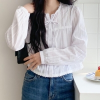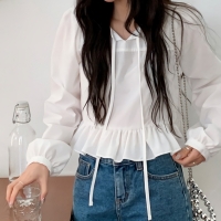 여성 코튼 러플 브이넥 리본 퍼프 블라우스