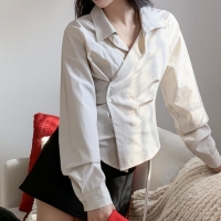 여성 핀턱 스트랩 플레어 크롭 블라우스