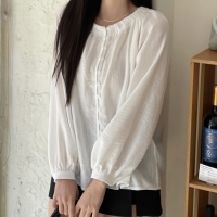 여성 루즈핏 셔링 버튼 플레어 블라우스