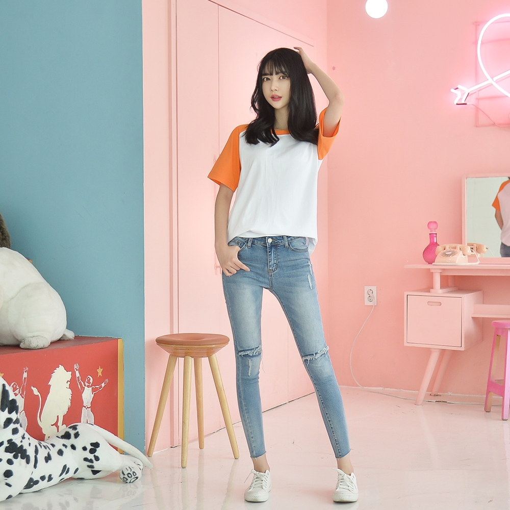 여성 핀턱 절개 라인 워싱 데님 스키니