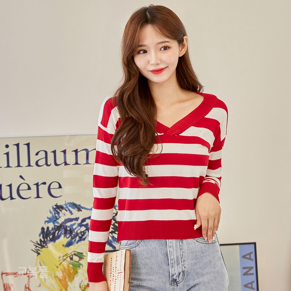 교복몰 긴팔 브이넥 레드 스트라이프 티셔츠 레트로