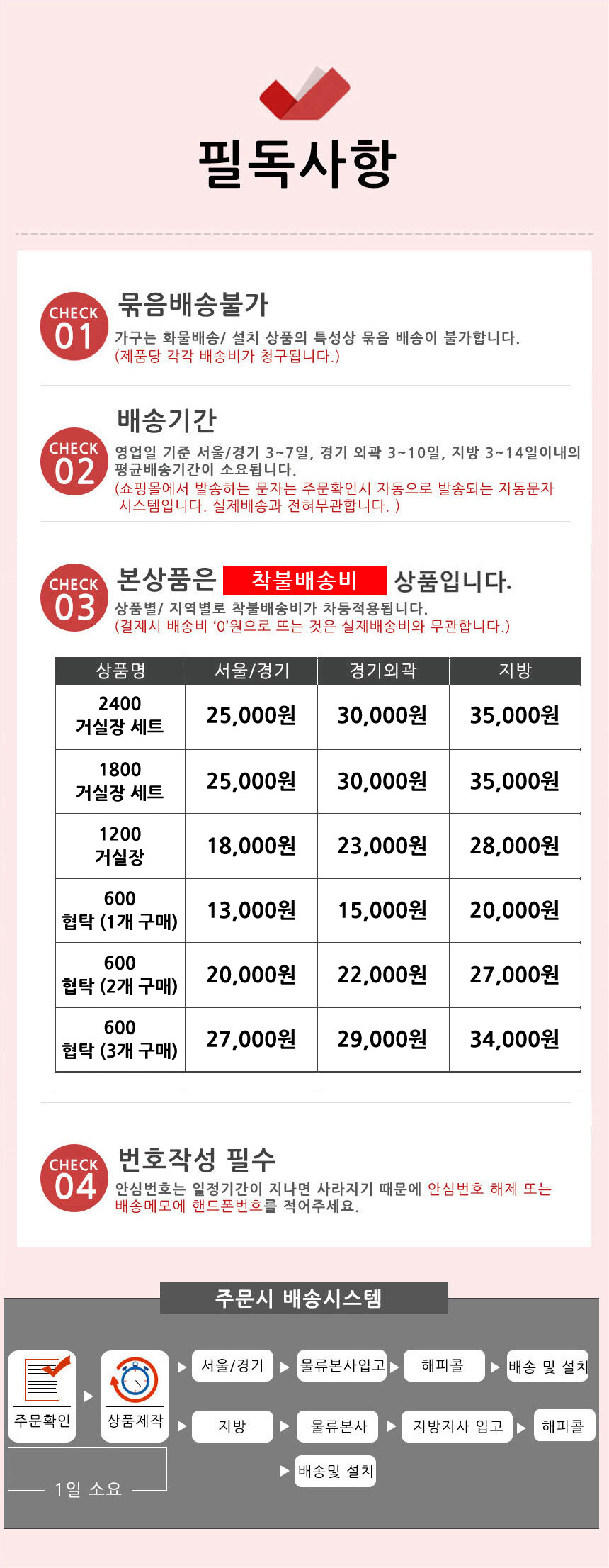 배송알림 상품별, 지역별로 배송비가 차등적용되오니 상세페이지를 꼭 확인해 주세요.