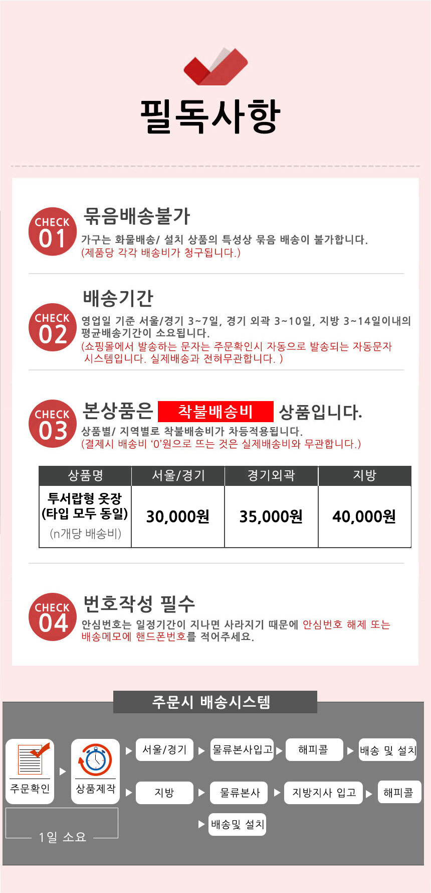 배송알림 상품별, 지역별로 배송비가 차등적용되오니 상세페이지를 꼭 확인해 주세요.