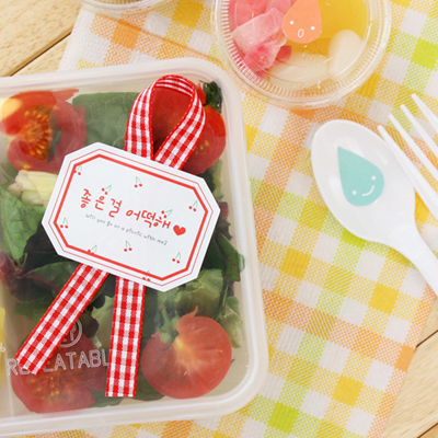 구성품 내열1칸, 내열2칸, 내열원형, 플라스틱 수저, 포크, 유산지, 리본, 마끈 외