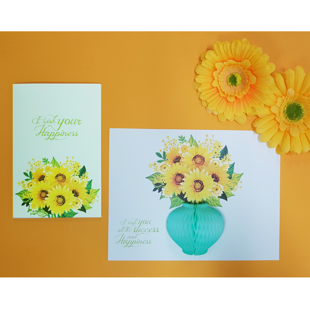 단아한 느낌의 꽃병에 활짝핀 해바라기 꽃이 마음을 따뜻하게 만드는 디자인입니다.