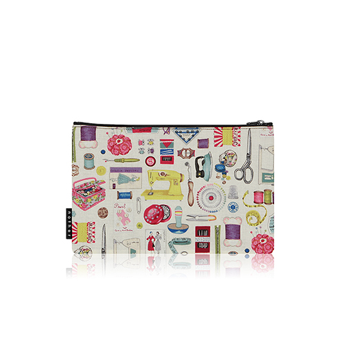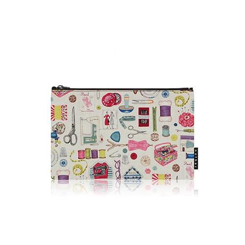 레트로 감성의 봉재 용품들을 패턴화한 코튼 소재 파우치 입니다.