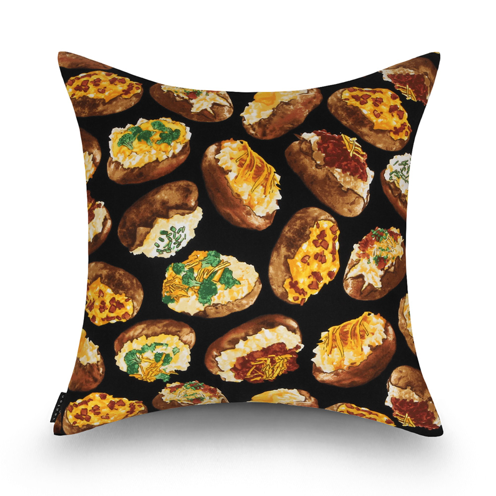 블랙 컬러 배경위에 다양한 토핑의 먹음직스런 베이크 포테이토가 디자인된 유니크 감성의 쿠션 입니다.