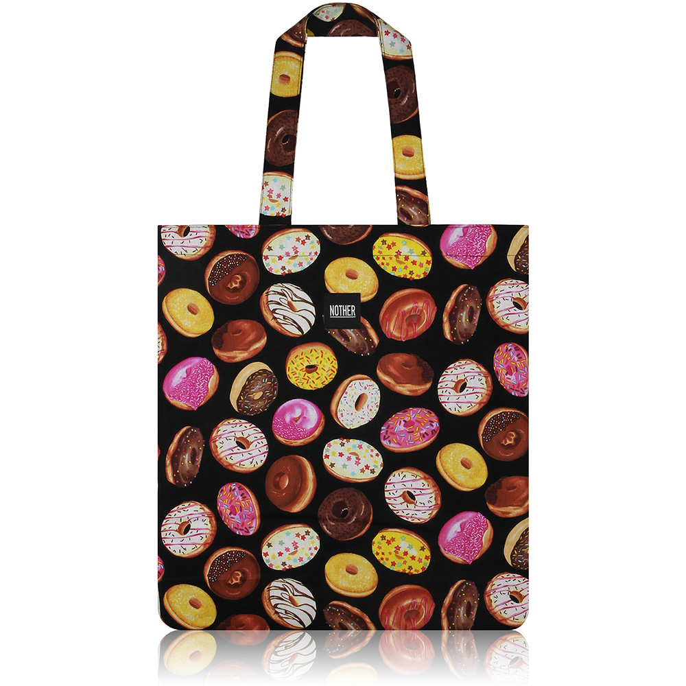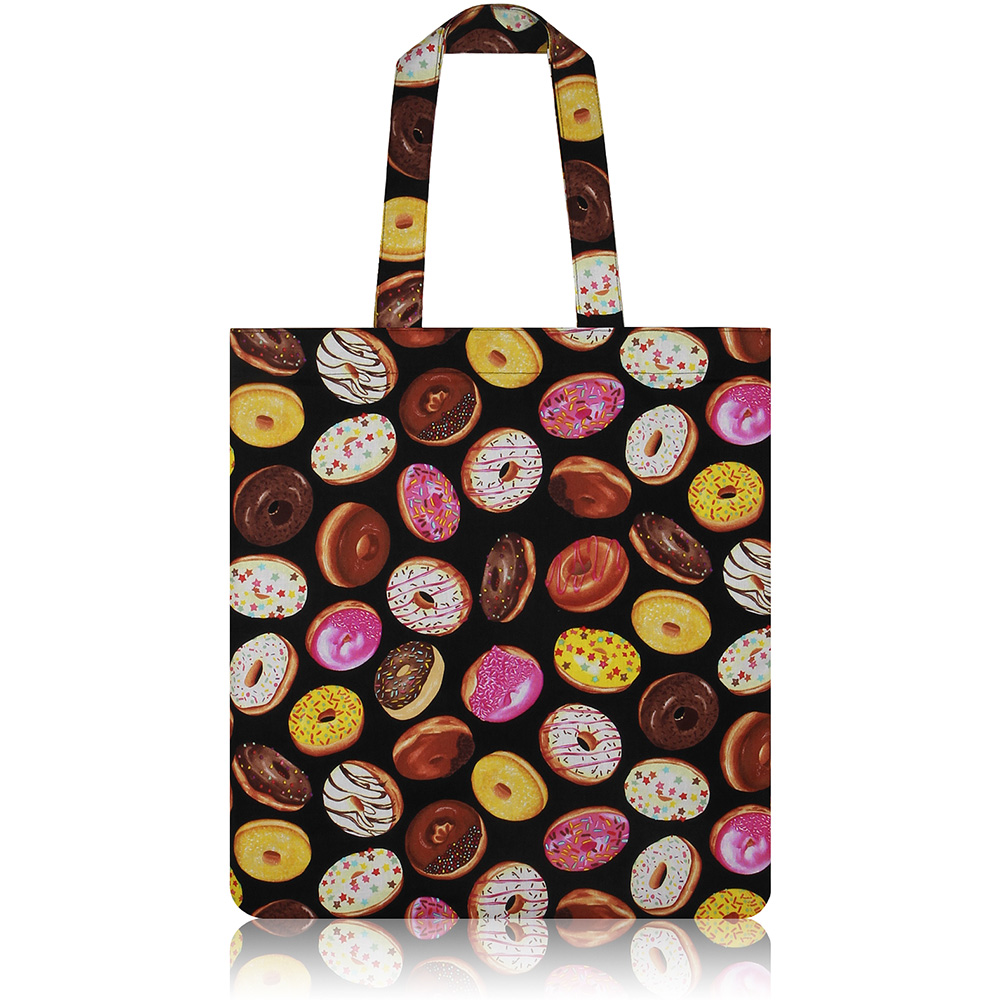 Frosted donuts print black cotton fabric. Twin grab handles & Inner pocket.