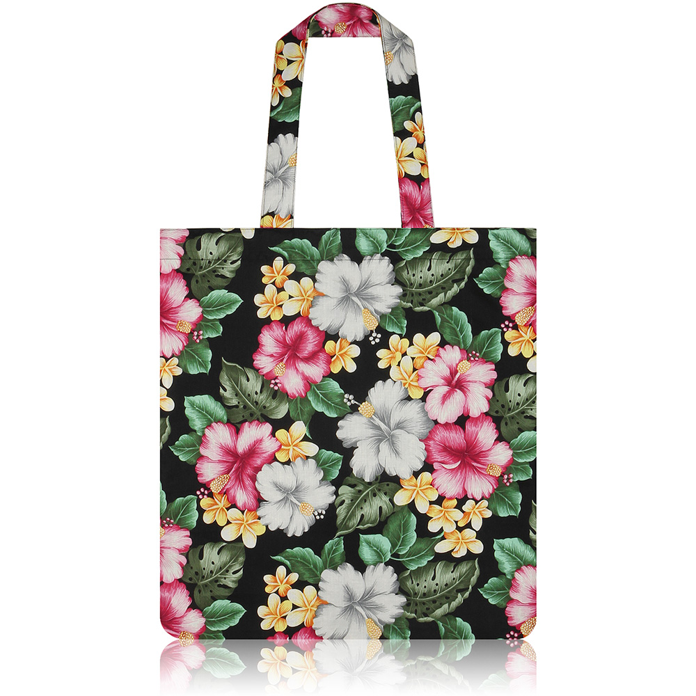 A stunning bag of Hawaiian-inspired tropical print, featuring hibiscus, plumeria and other tropical leaves. Twin grab handles & Inner pocket.