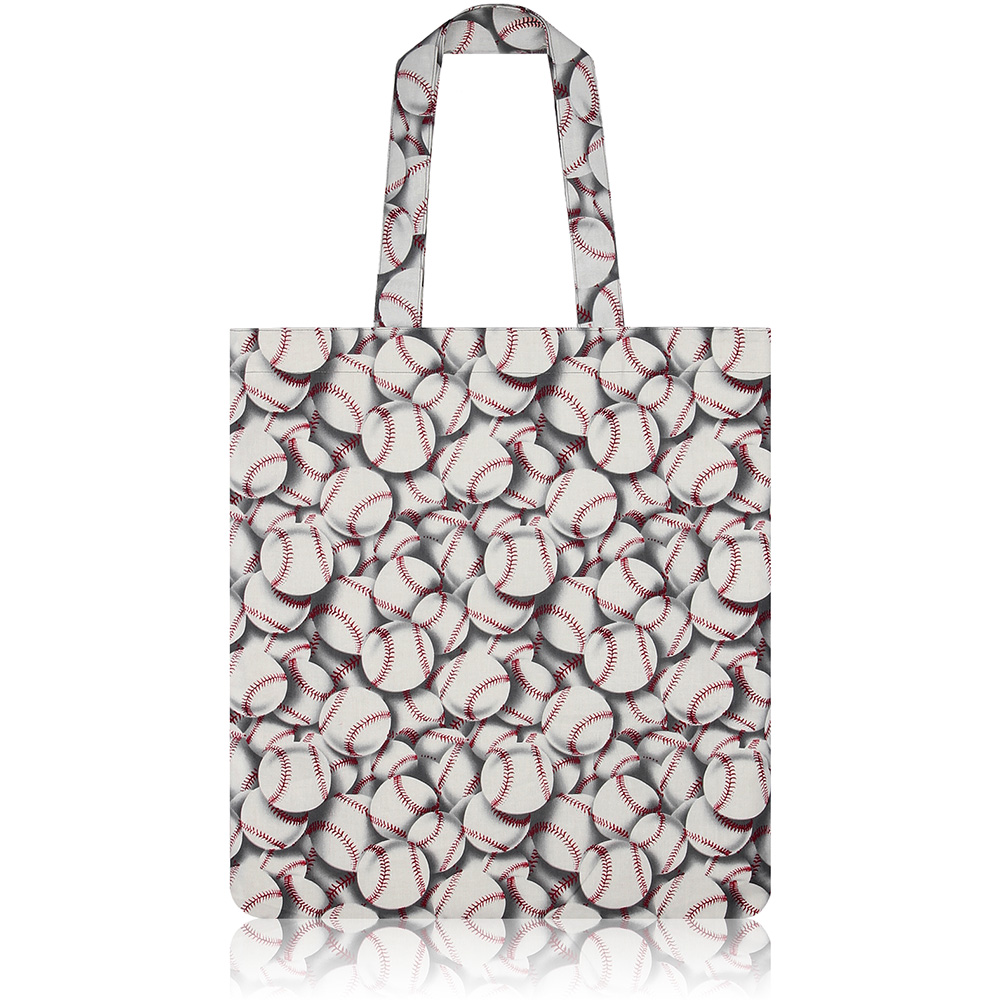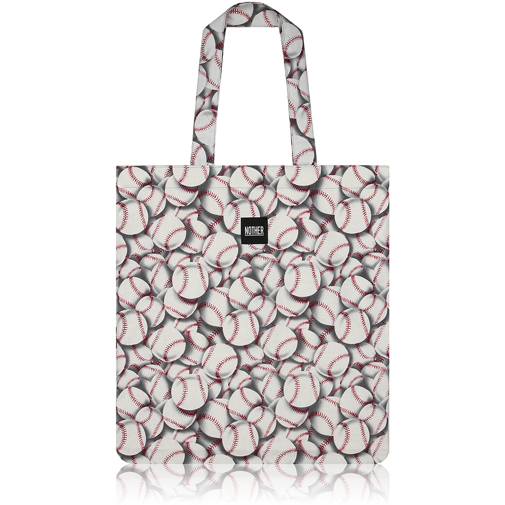 붉은 색 실밥의 야구공들이 가득 들어찬 코튼 소재 토트백 입니다.