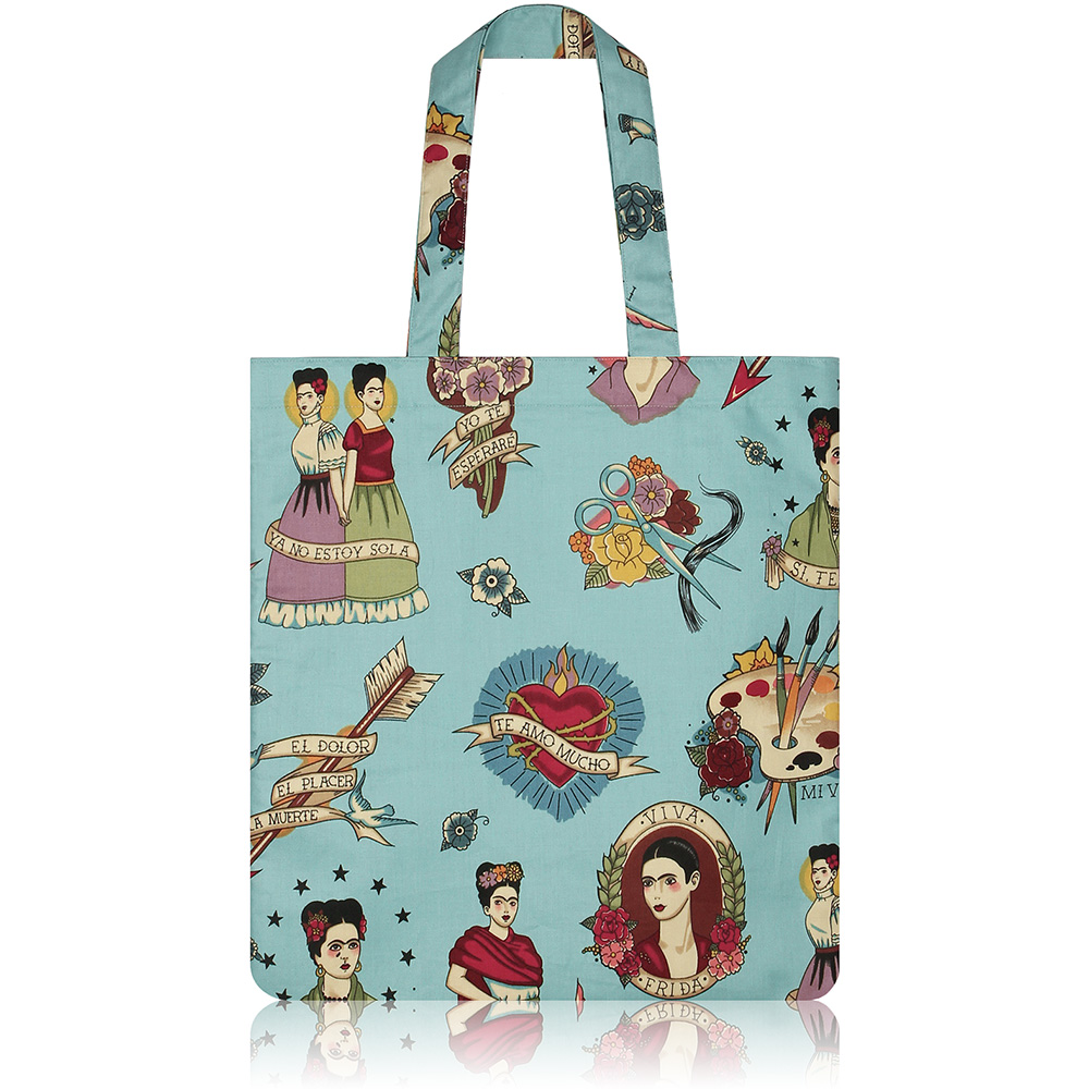 Traditional Tattoo designs of Frida Kahlo and Classic Flash Art on Turquoise cotton fabric. Twin grab handles & Inner pocket.