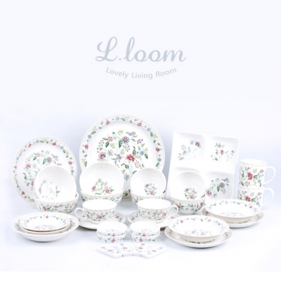 구성품 원형 접시 L, 원형 접시 M,원형 접시 S 네칸접시, 머그, 찻잔 찻잔받침, 원형 찬기 L, 원형 찬기 M 원형 찬기 S, 수저받침, 종기, 공기, 대접
