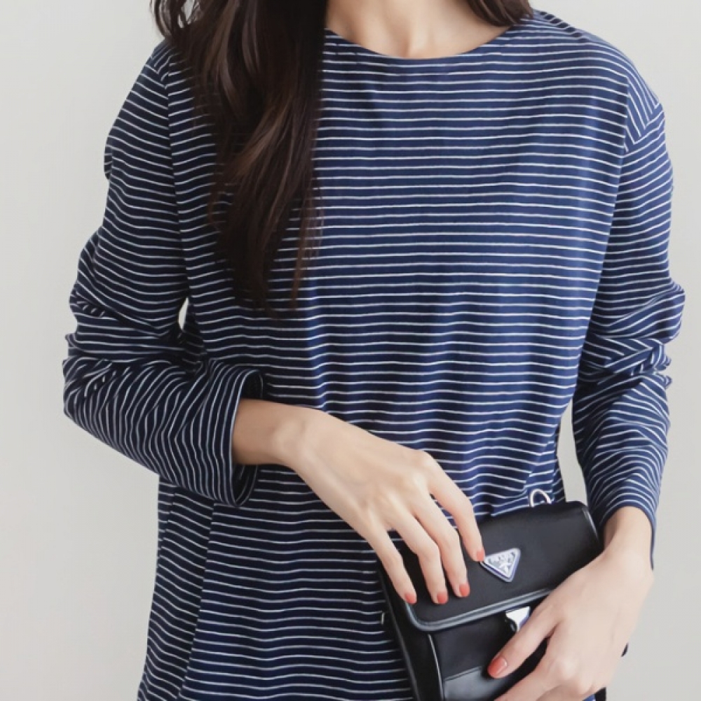 여성 콤마 스트라이프 라운드 기본 티셔츠