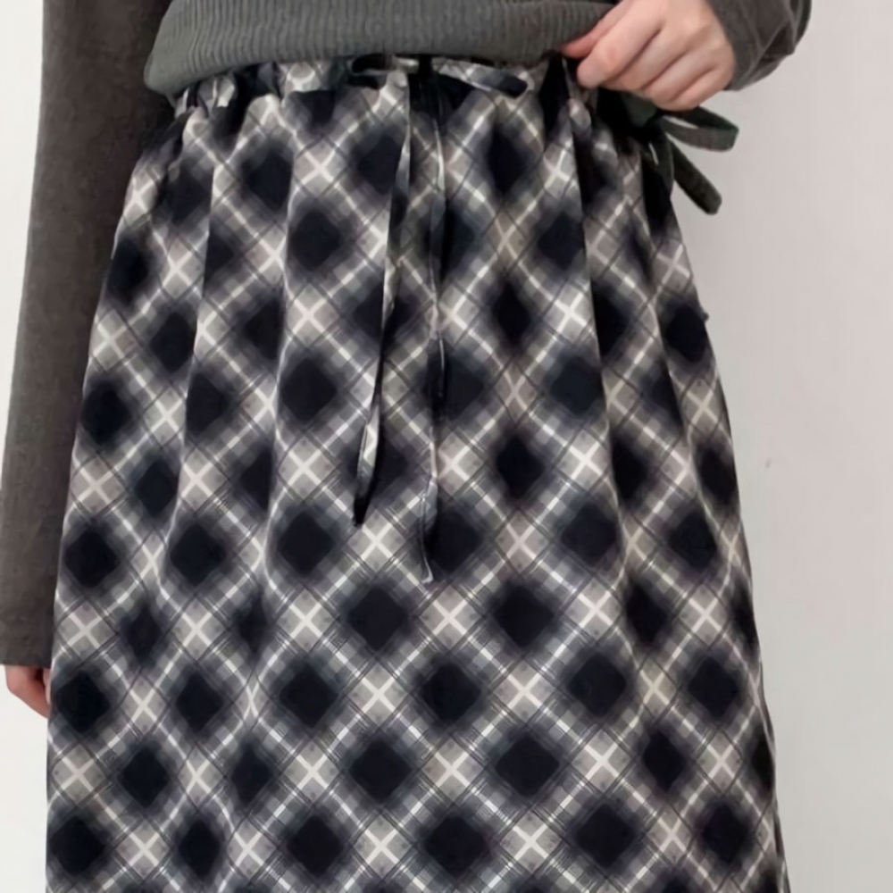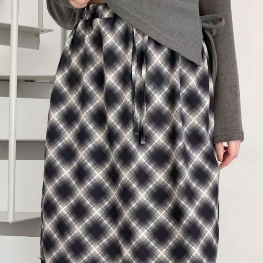 여성 겨울 레이어드 체크 밴딩 미디스커트