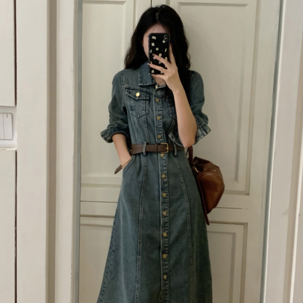 여성 가을 겨울 벨트 세트 데님 롱원피스