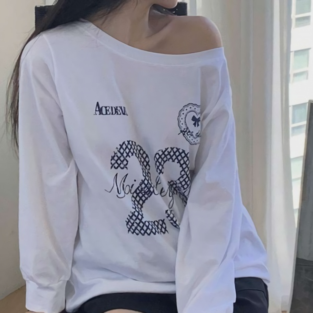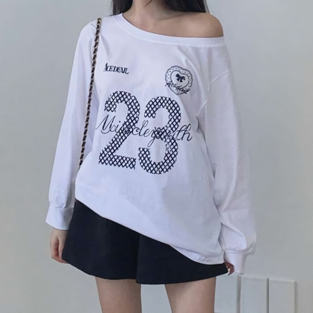 프린팅 보트넥 원 오프숄더 오버핏 맨투맨