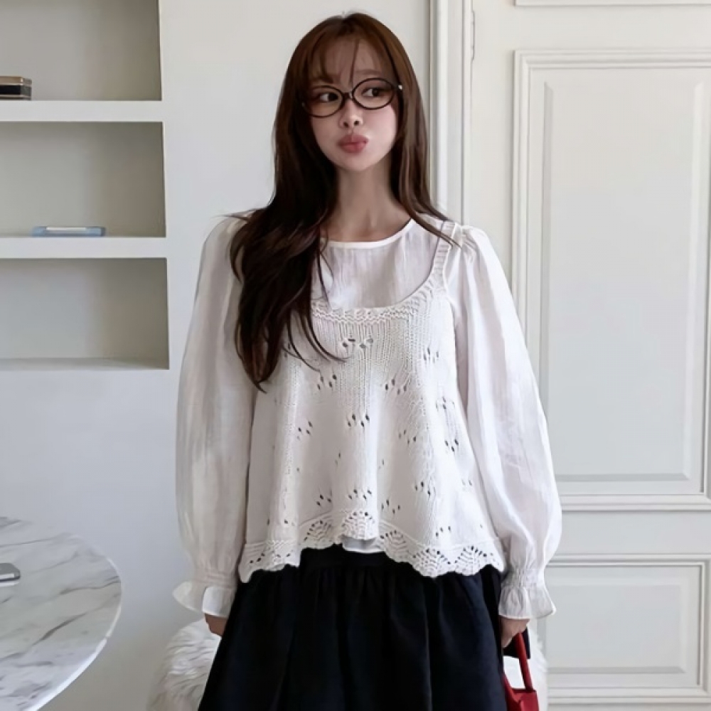 펀칭 니트 뷔스티에 셔링 블라우스 세트