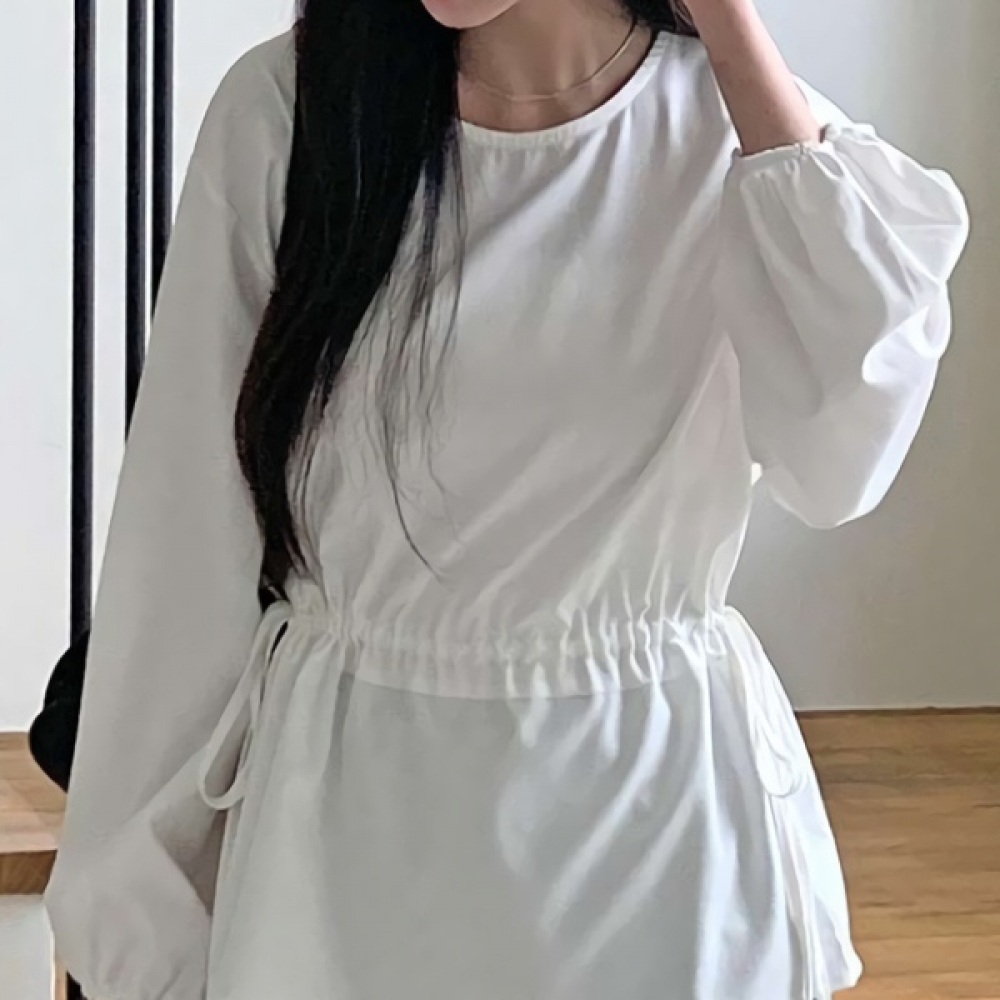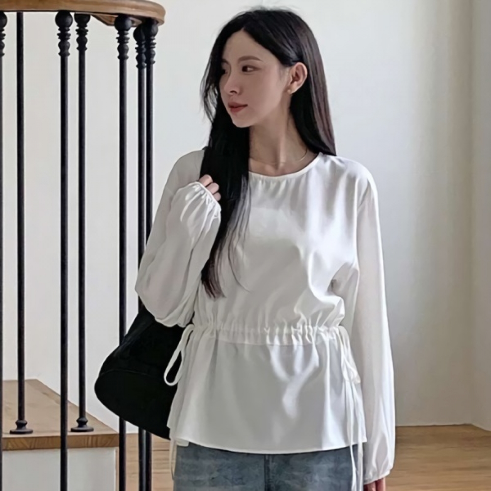 오버핏 리본 스트랩 긴팔 라운드 블라우스