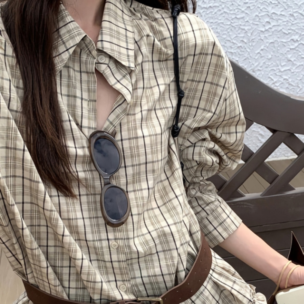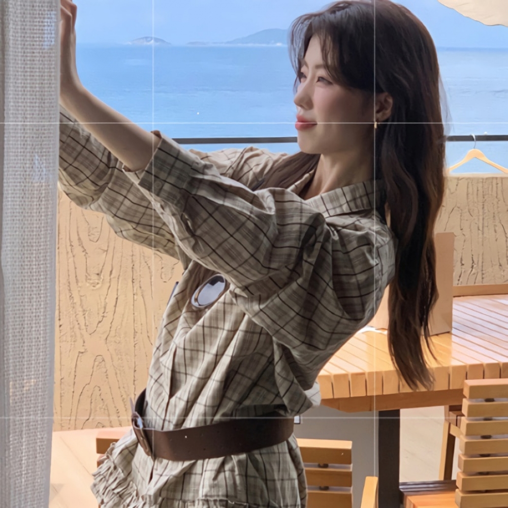 여성 가을 겨울 밑단 프릴 체크셔츠 벨트