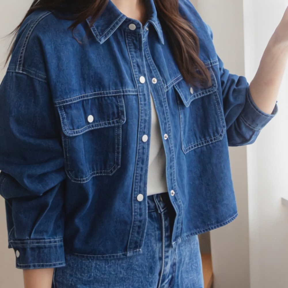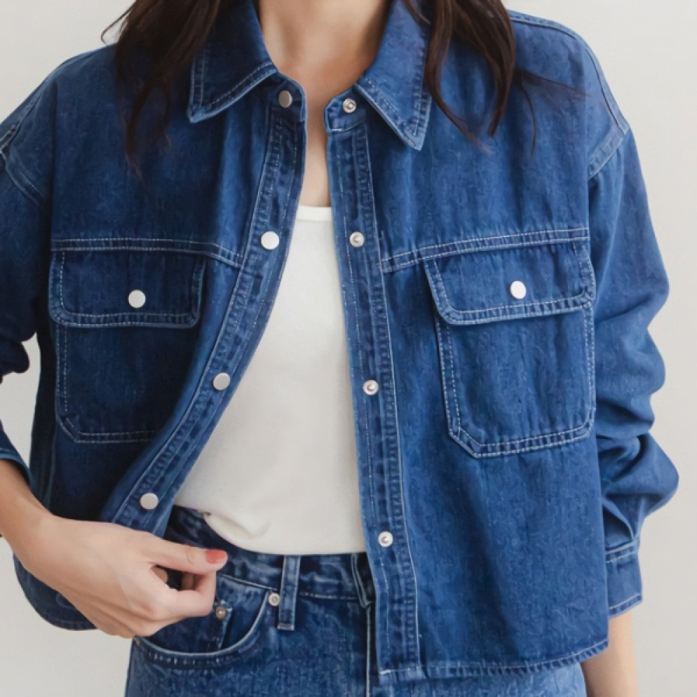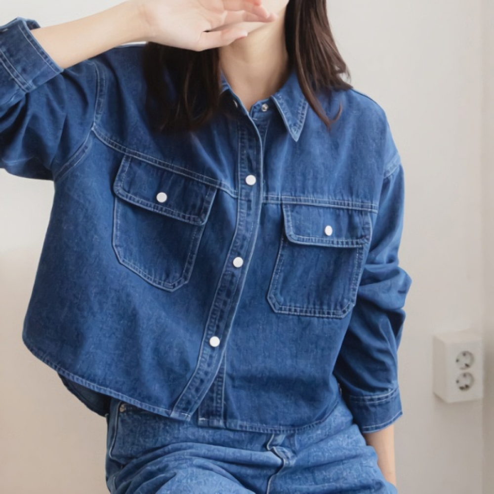 여성 모던 청 버튼 카라 크롭 데님 셔츠