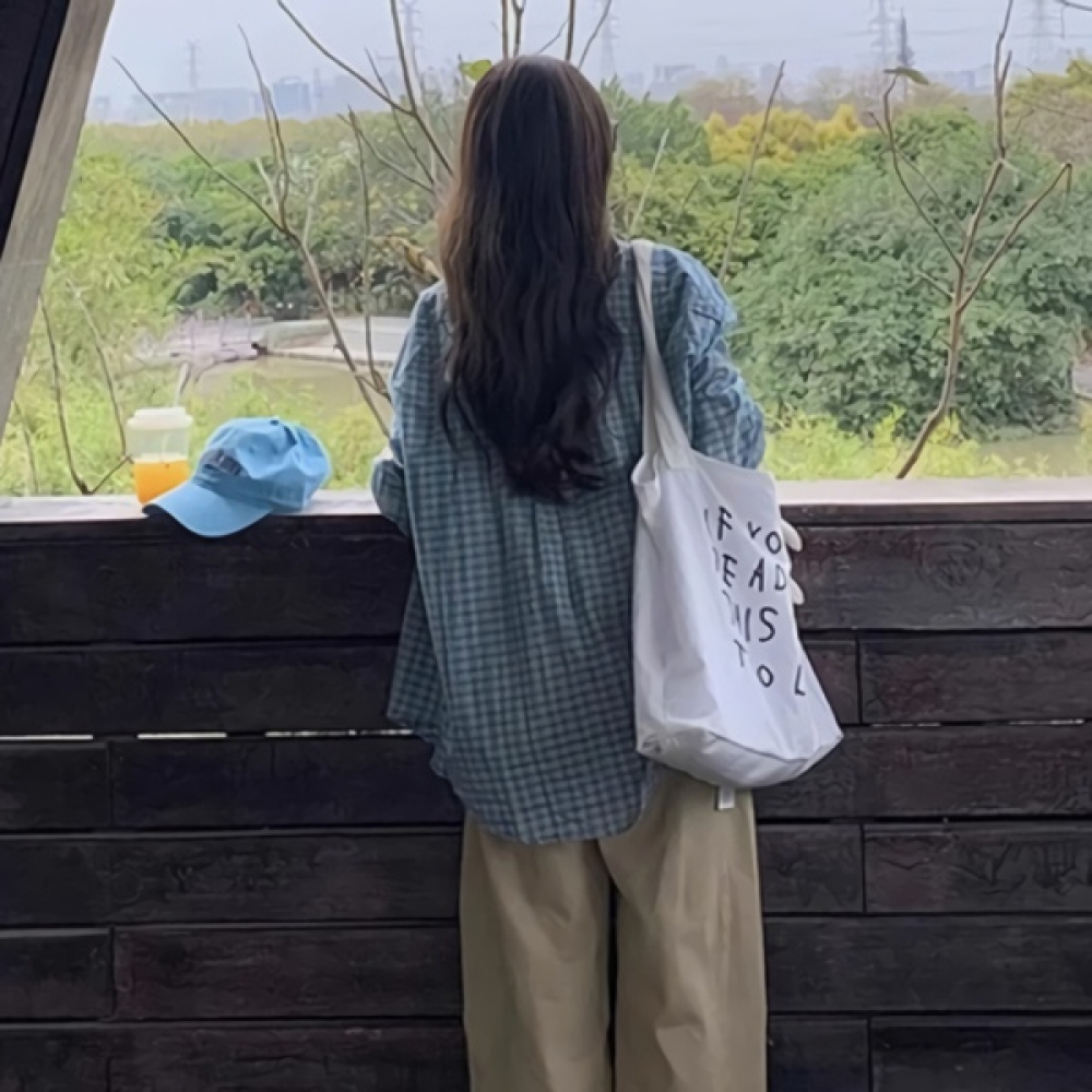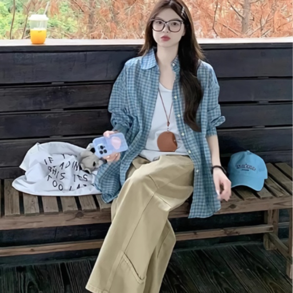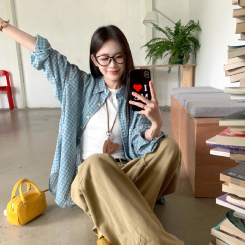 여성 가을 겨울 블루 체크 루즈핏 셔츠