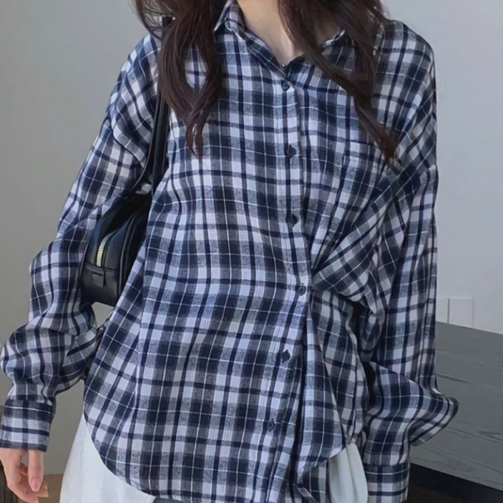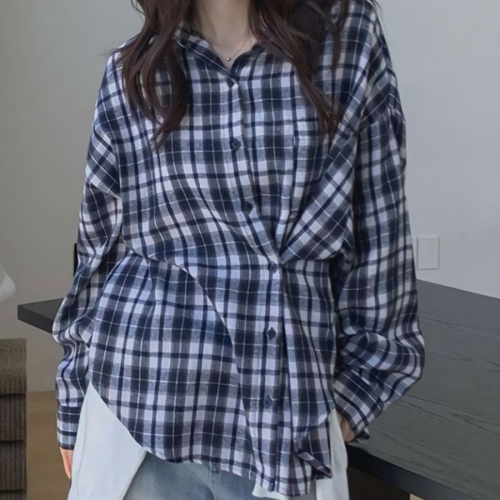 여성 텐셀 오버핏 옆단추 체크 셔츠