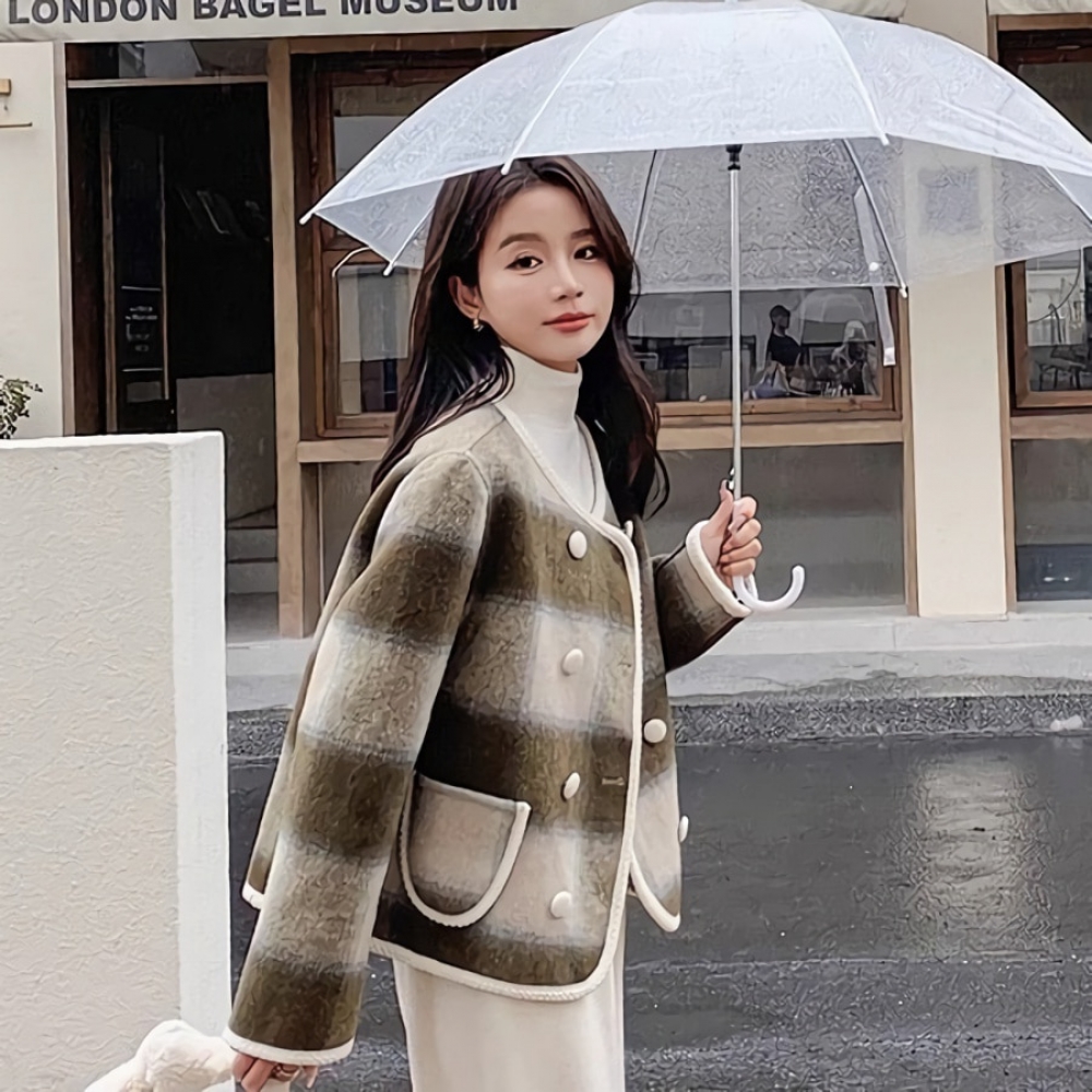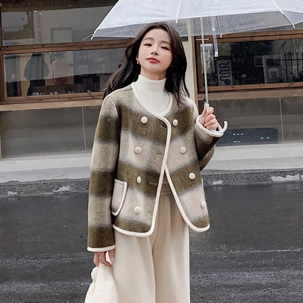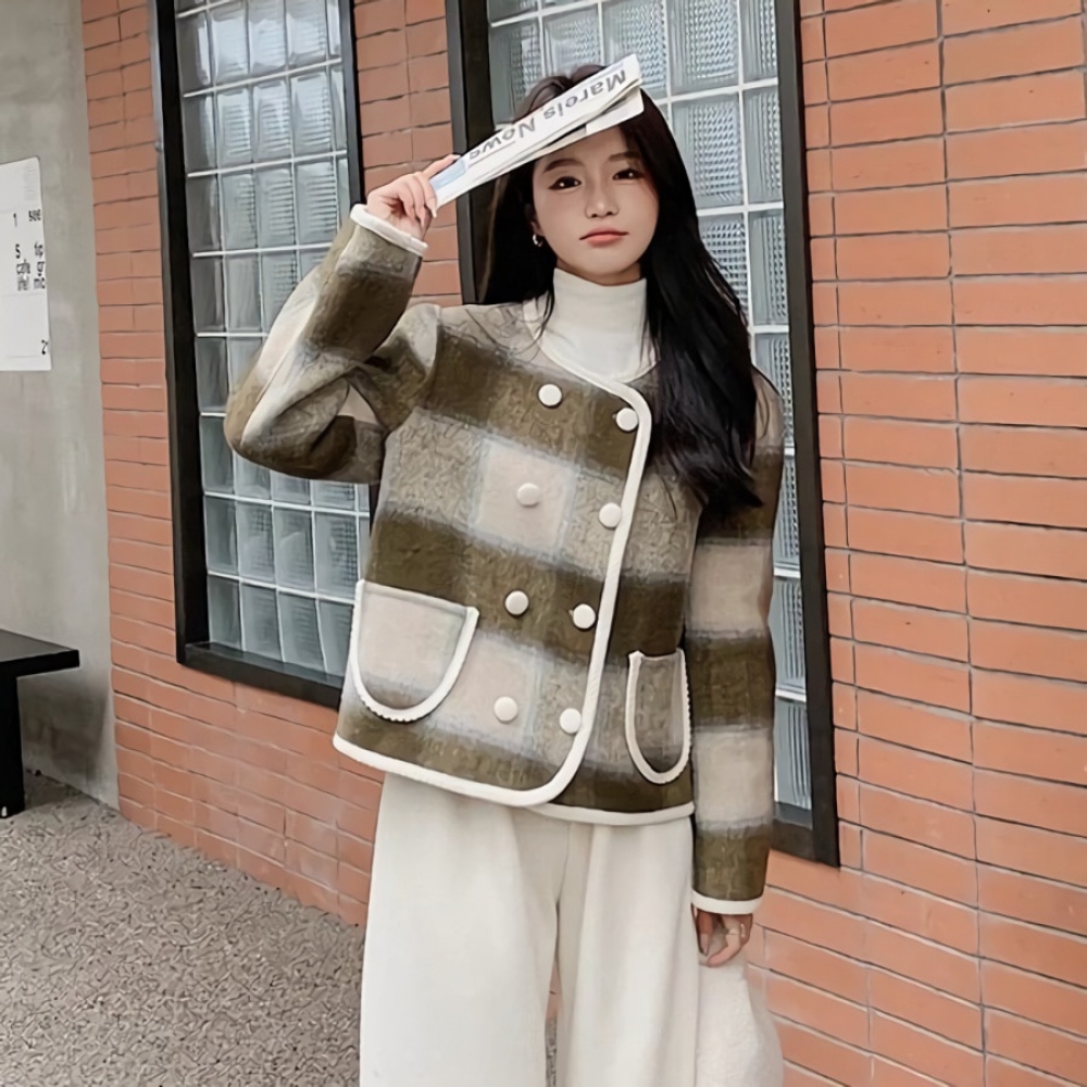 스타일리시한 체크 더블 버튼 숏 모직 코트