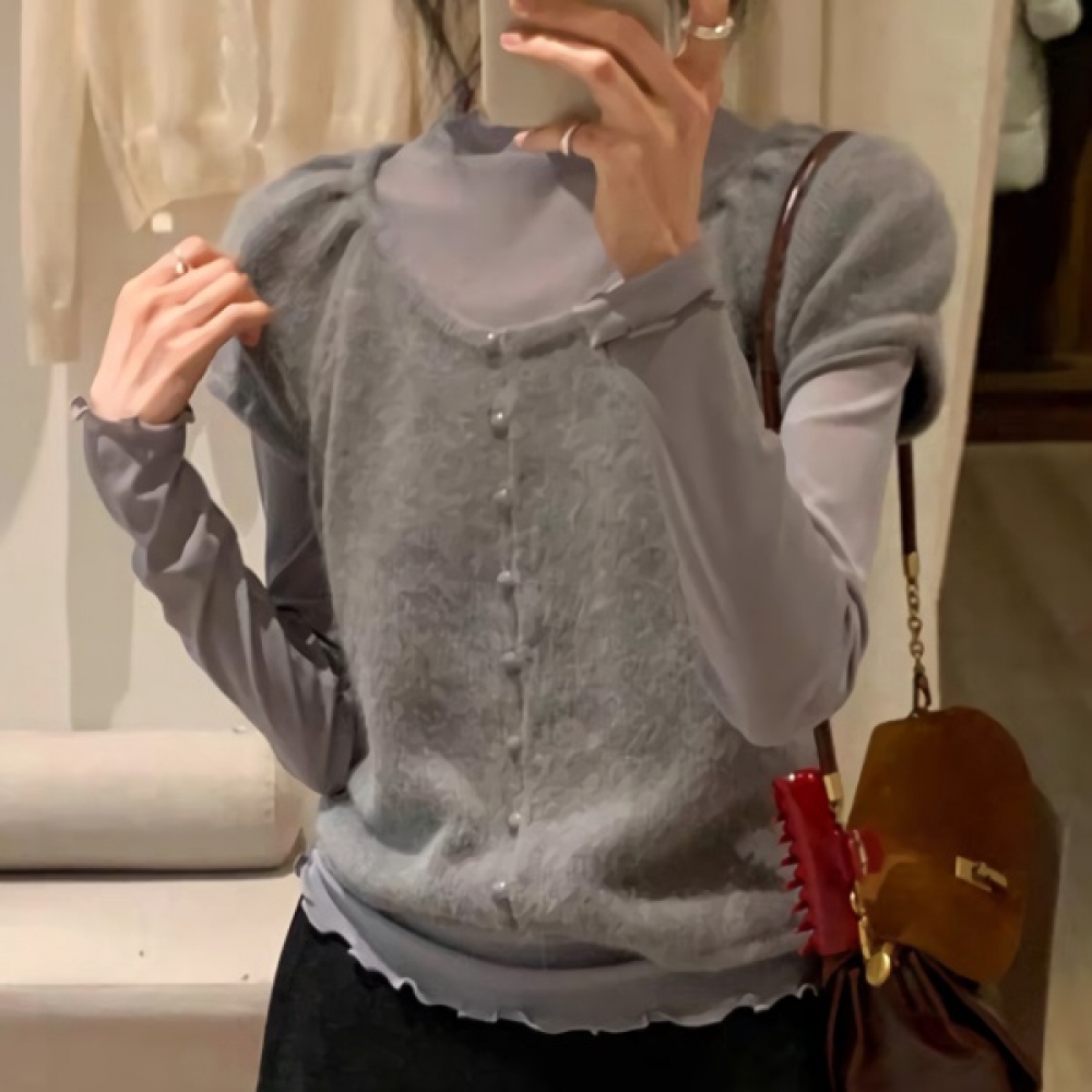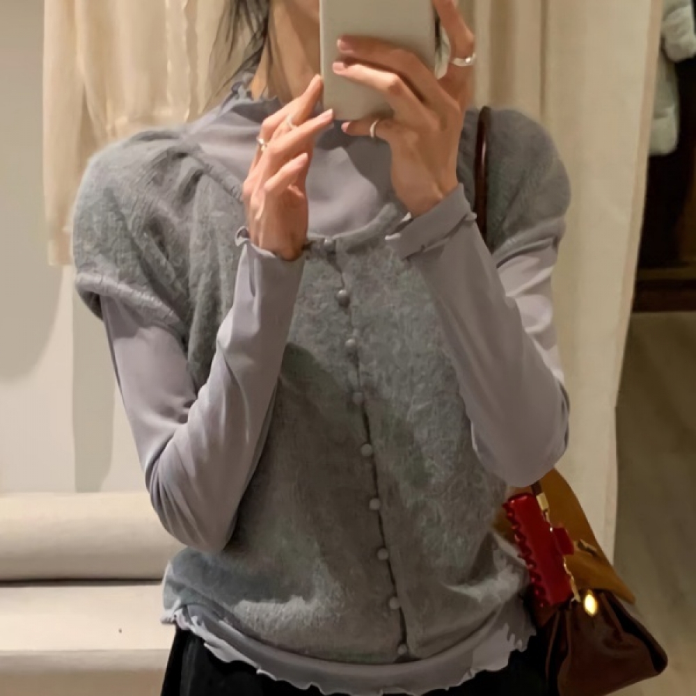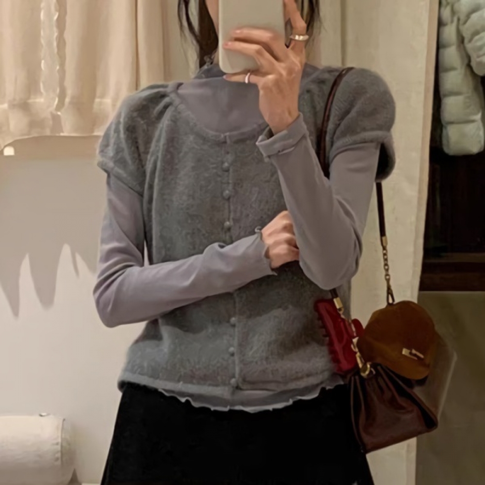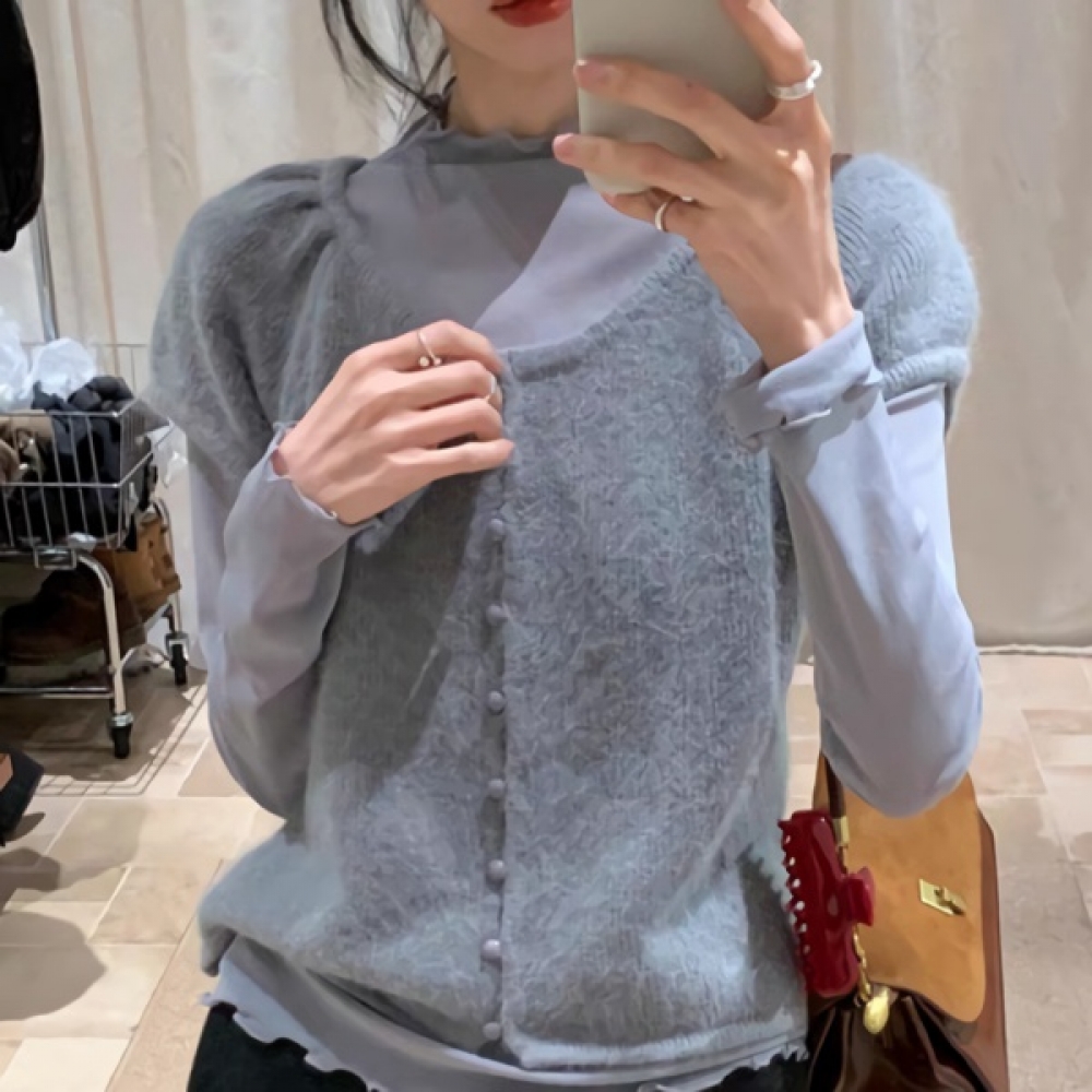 여성 봄 데일리 앙고라 셔링 반팔 가디건
