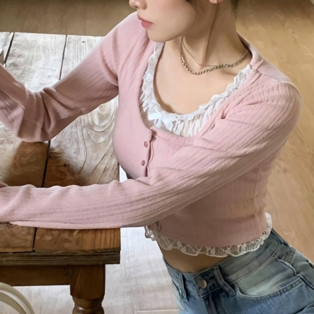 여성 리본 프릴 레이스 레이어드 크롭 가디건