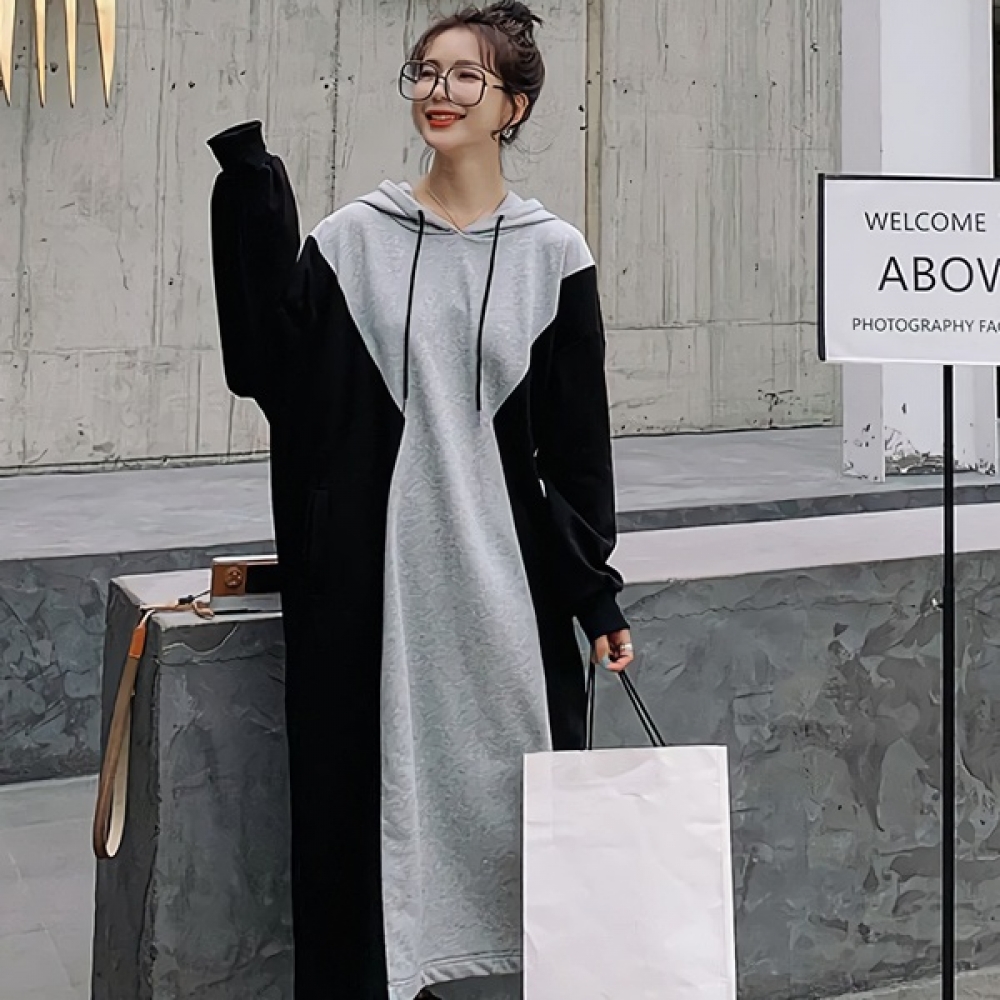 여성 봄 배색 후드 롱 원피스 캐주얼 데일리룩