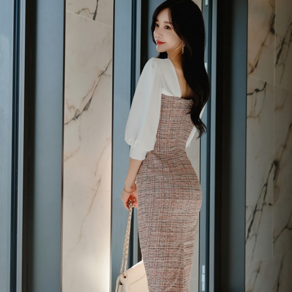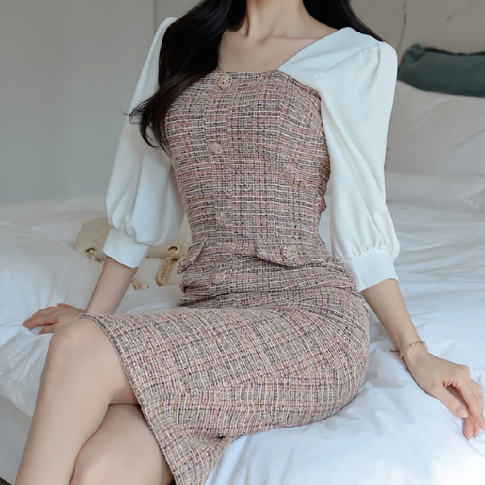 여성 봄 트위드 버튼 스퀘어넥 원피스
