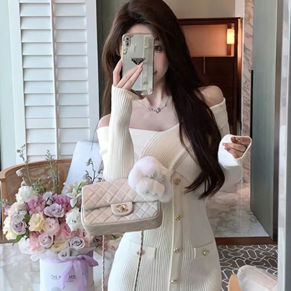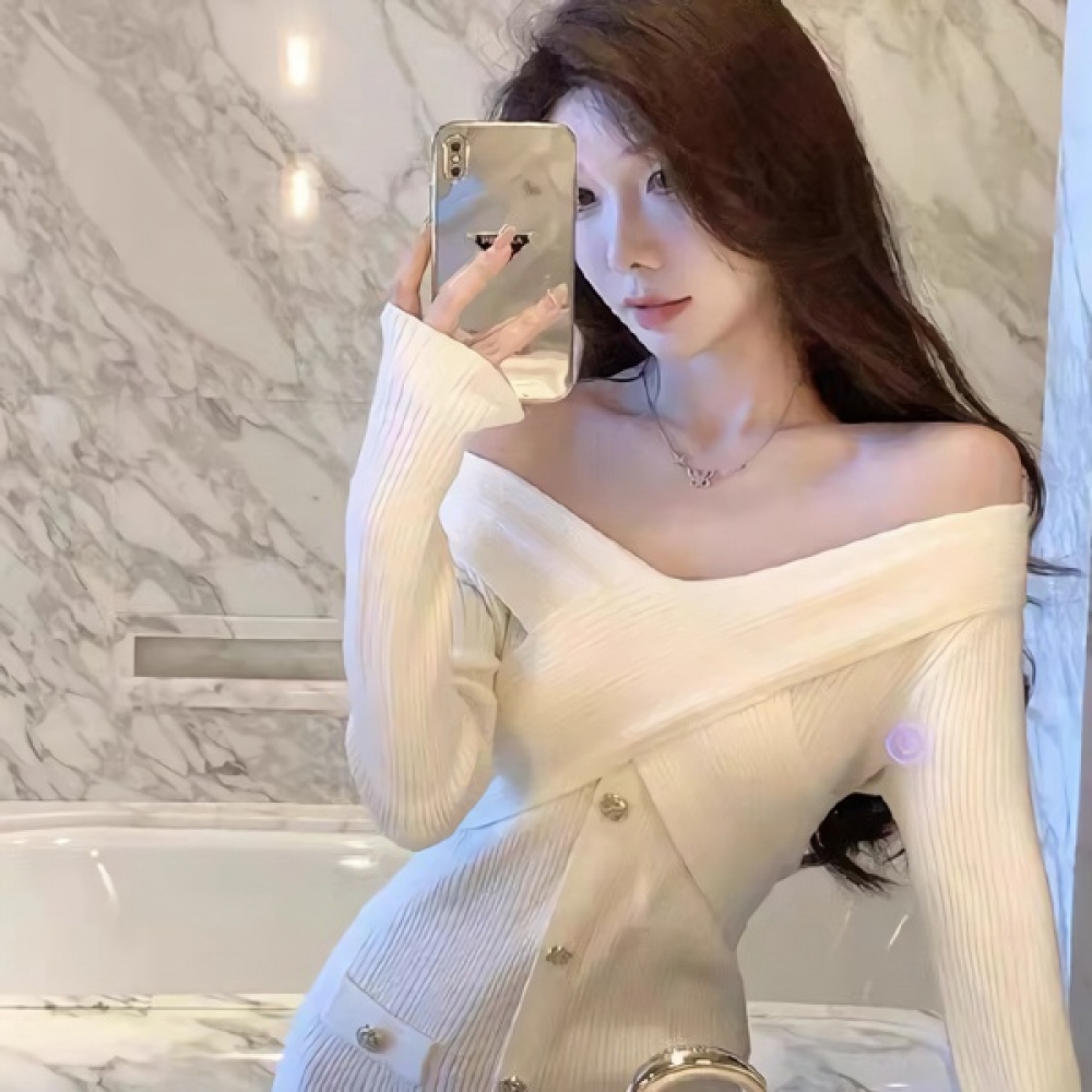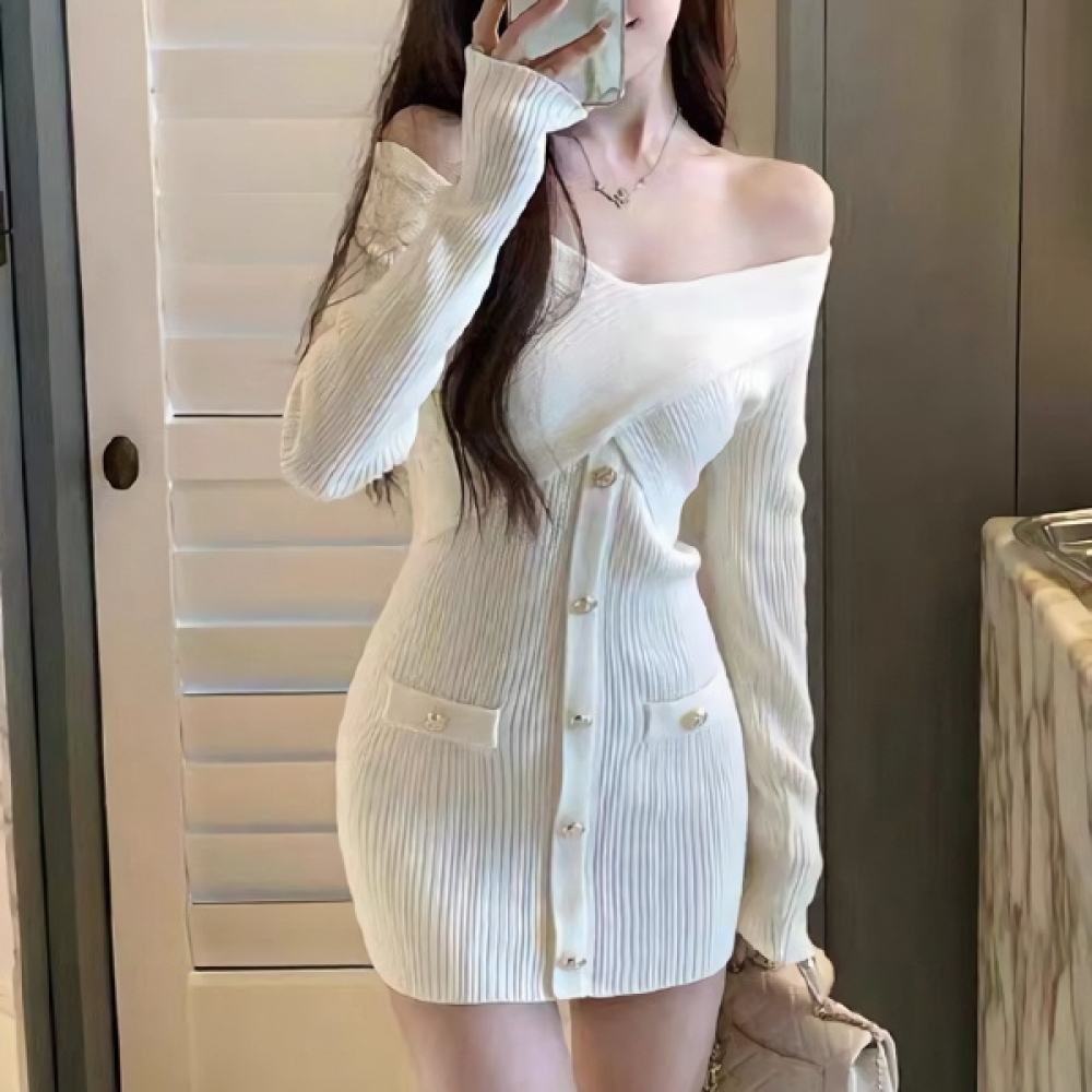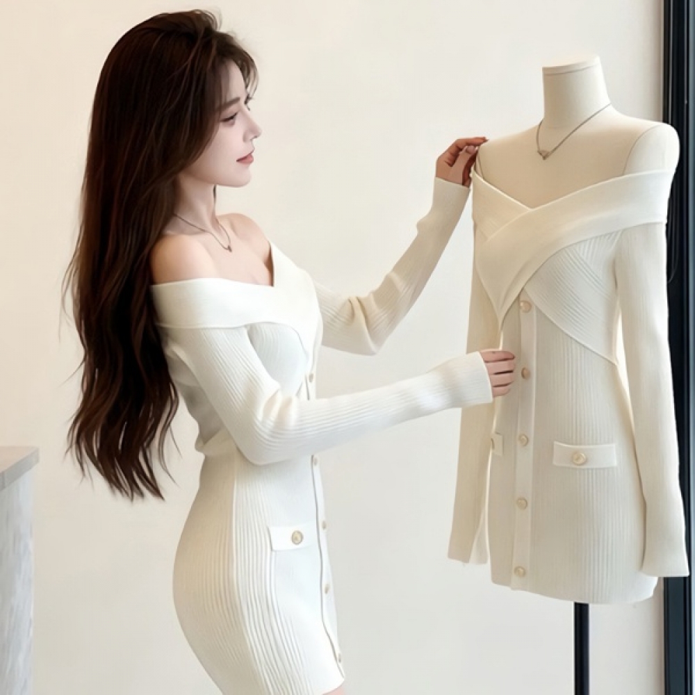 여성 오프숄더 크로스 니트 미니 원피스