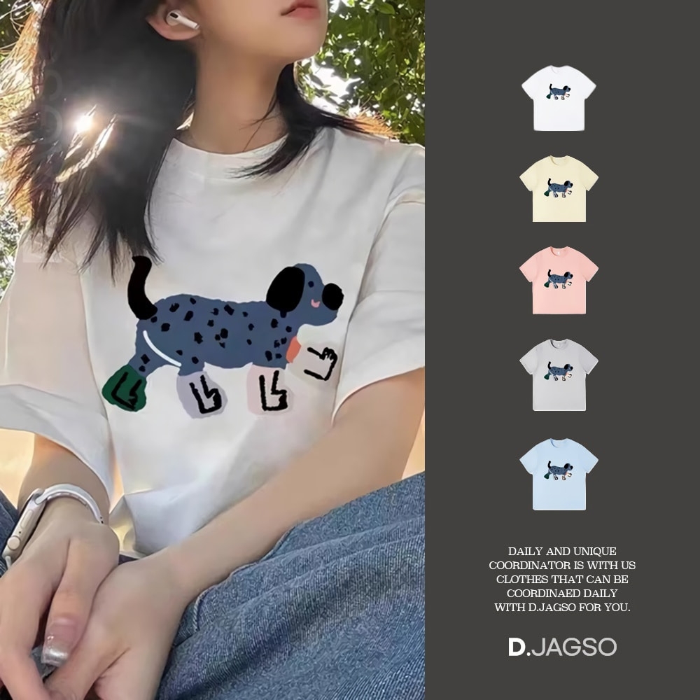 여성 강아지 콜라주 일러스트 캐주얼 봄 반팔티