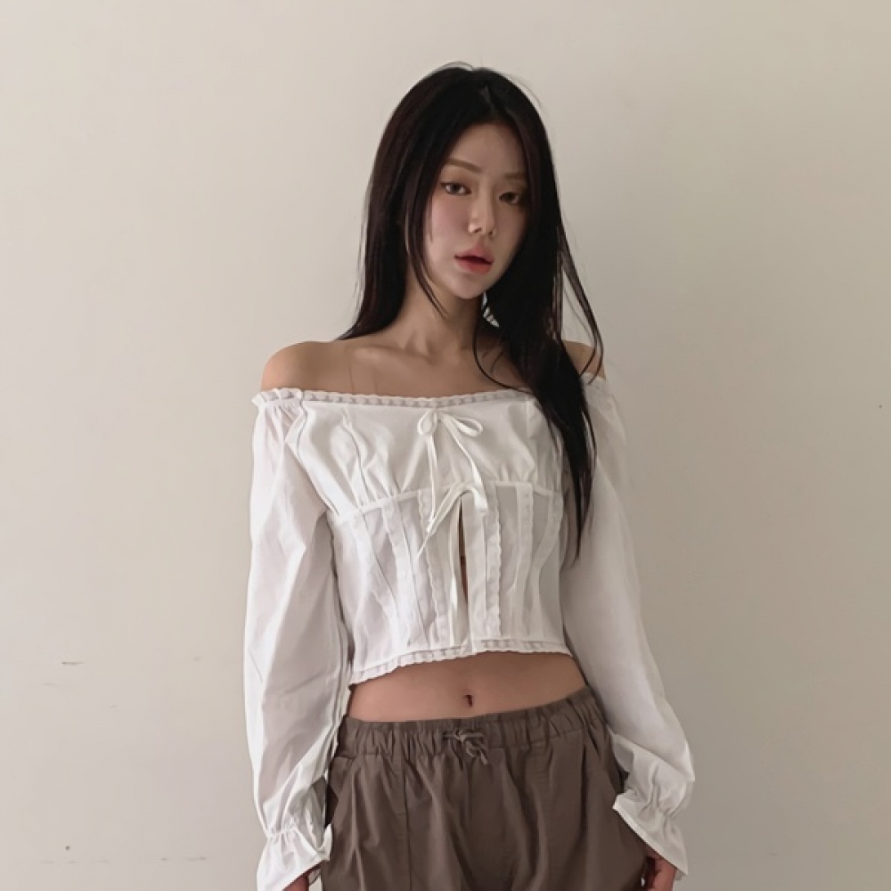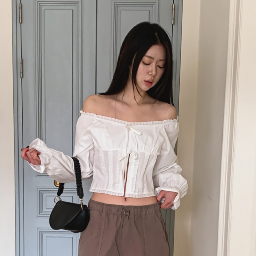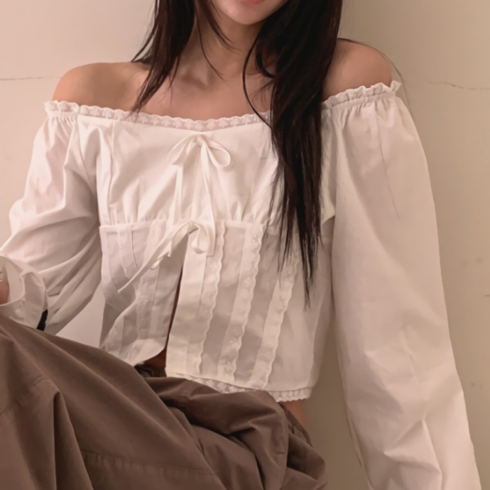 여성 리본 레이스 오프숄더 크롭 블라우스