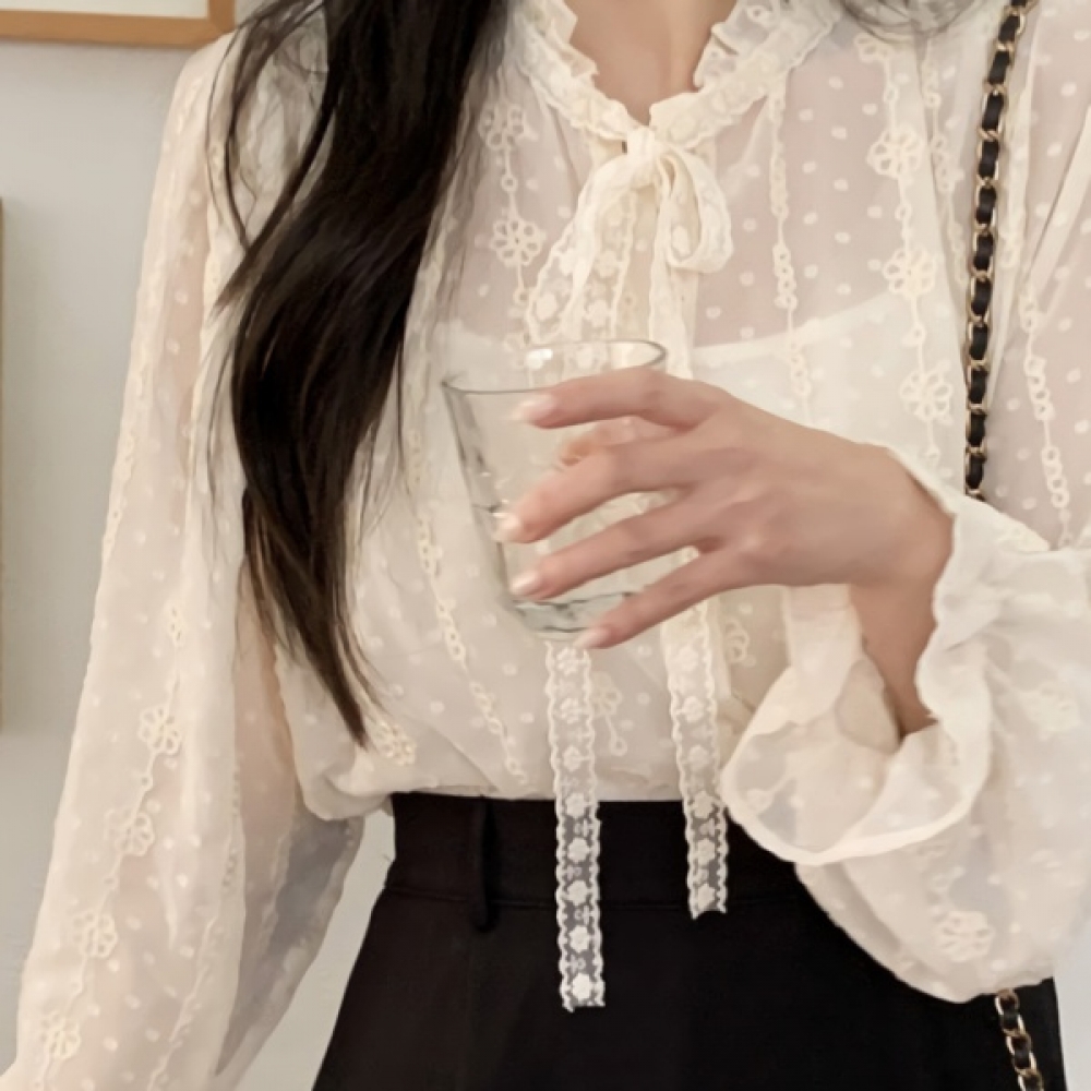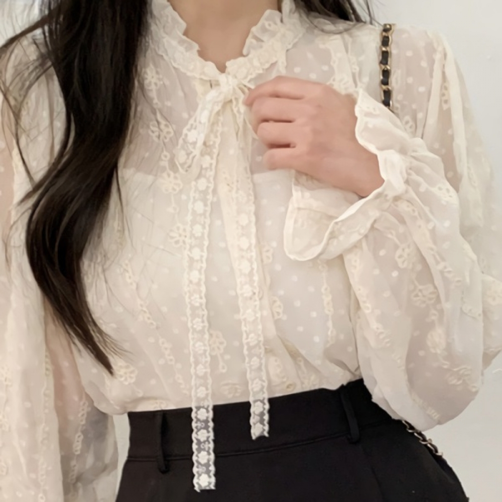 여성 코튼 러플 브이넥 리본 퍼프 블라우스